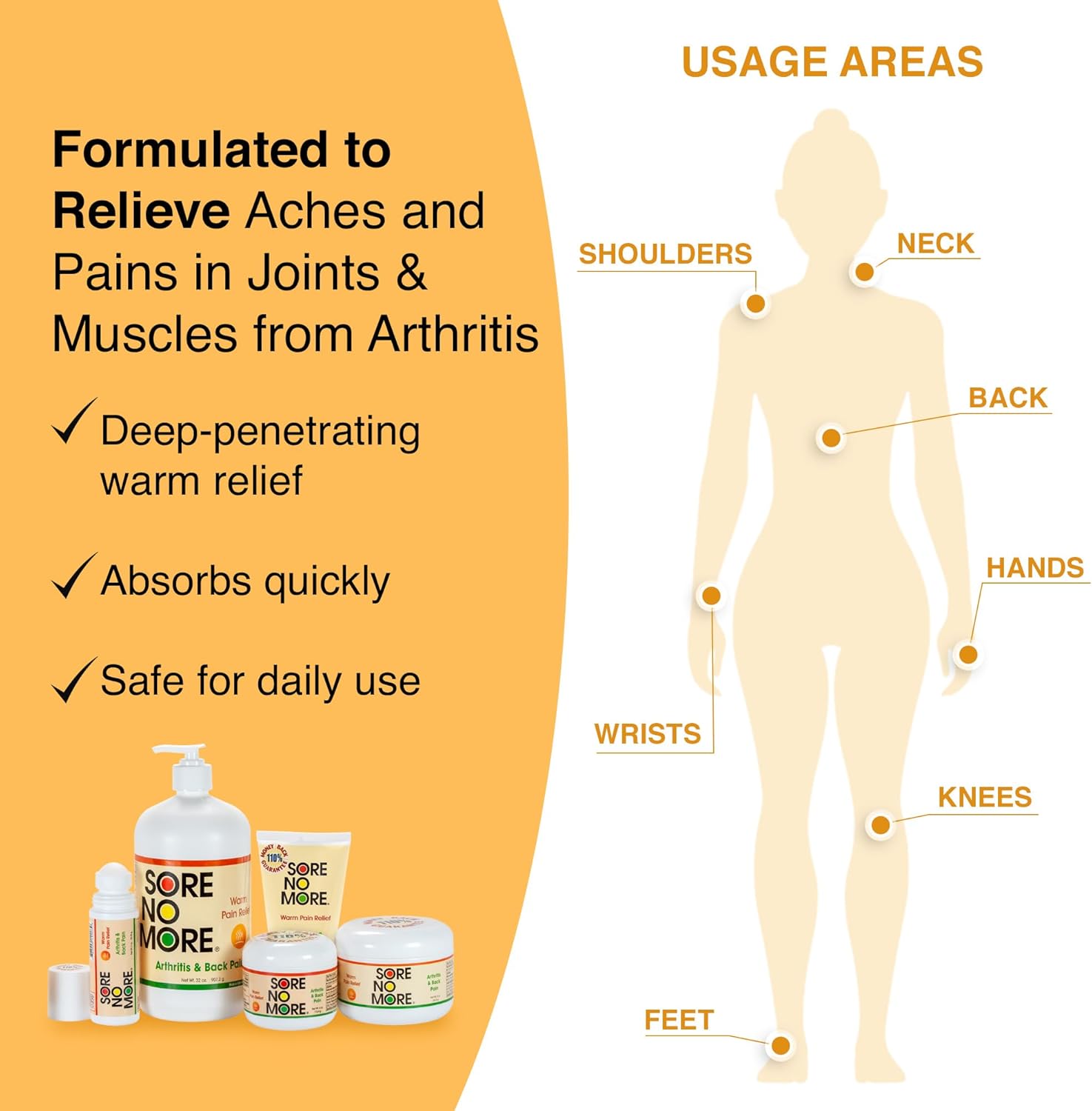 - Targeted Relief for Everyday Discomfort – Use Sore No More Warm arthritis pain relief roll on to help alleviate aches and pains in areas like the back, neck, hands, and feet, so you can feel more comfortable throughout your day