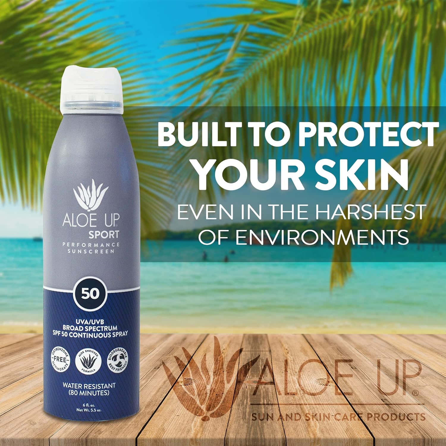 ALOE UP Sport Continuous Spray Sunscreen SPF 50 - Broad Spectrum UVA/UVB Sunscreen Protector for Face and Body - With Aloe Vera Gel - Fast Absorbing Sheer Formula - Reef Safe - Fragrance-Free - 6 Oz