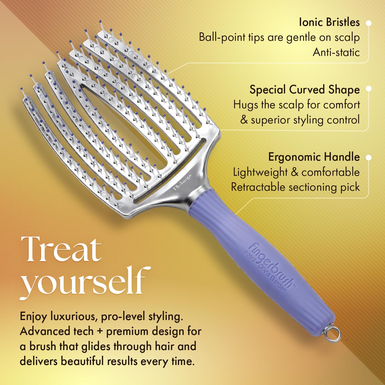 - Product Benefits : Scalp-hugging vented shape with ionic bristles massages while styling; lightweight ergonomic handle with pick. Scalp-hugging vented shape with ionic bristles massages while styling; lightweight ergonomic handle with pick.