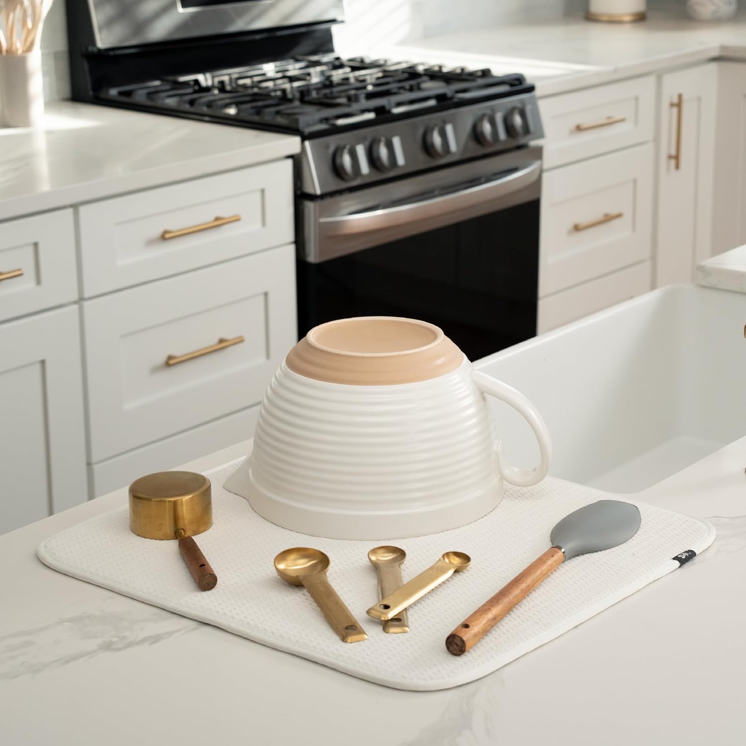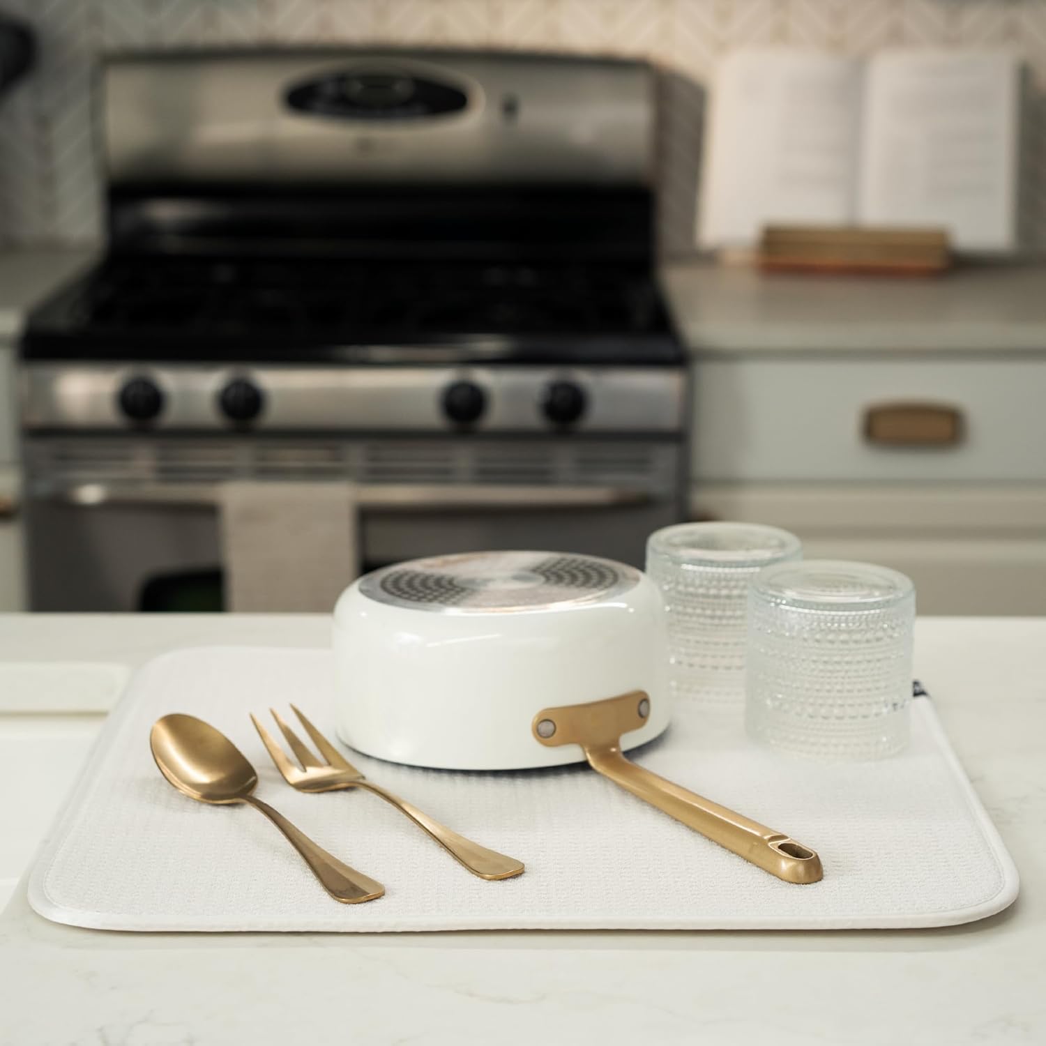 S&T INC. Dish Drying Mat, 16” x 18”, Absorbent Microfiber Kitchen Counter Mat, Dish Drying Pad for Dishes, Utensils, Pots and Pans, Large, Cream