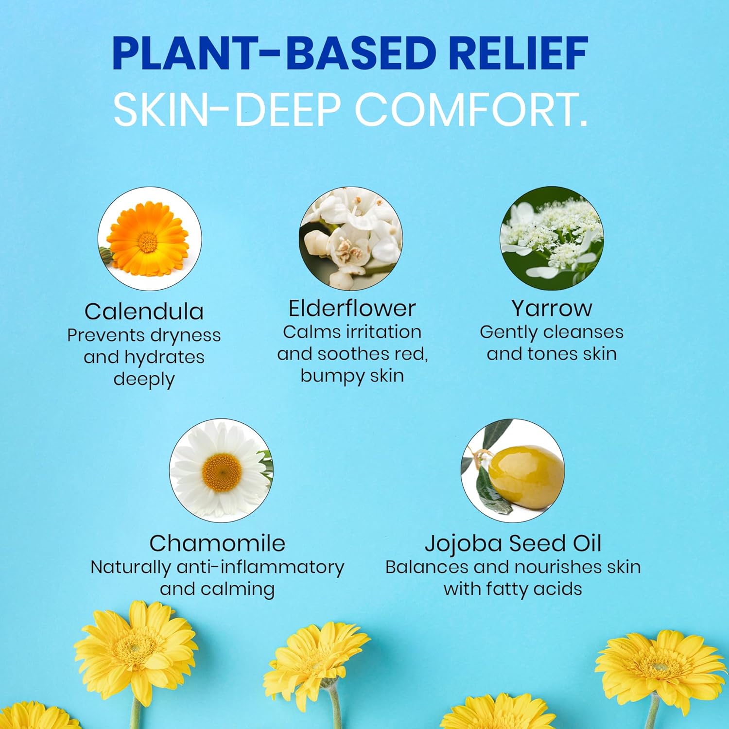 - PLANT-BASED INGREDIENTS: Packed with natural ingredients such as calendula to moisturize, chamomile & elderflower to help calm skin irritation, and yarrow to astringe & cleanse.