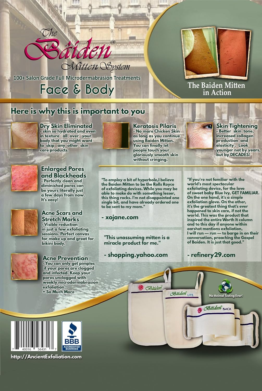 Baiden Exfoliator System-Best Firming Face Body & Back Scrub Mitts-Remove Blackheads, Dry Skin, Wrinkles, Cellulite, Controls Acne-Top Facial Lips Eyelids Treatment-Circulation and Collagen Boosting
