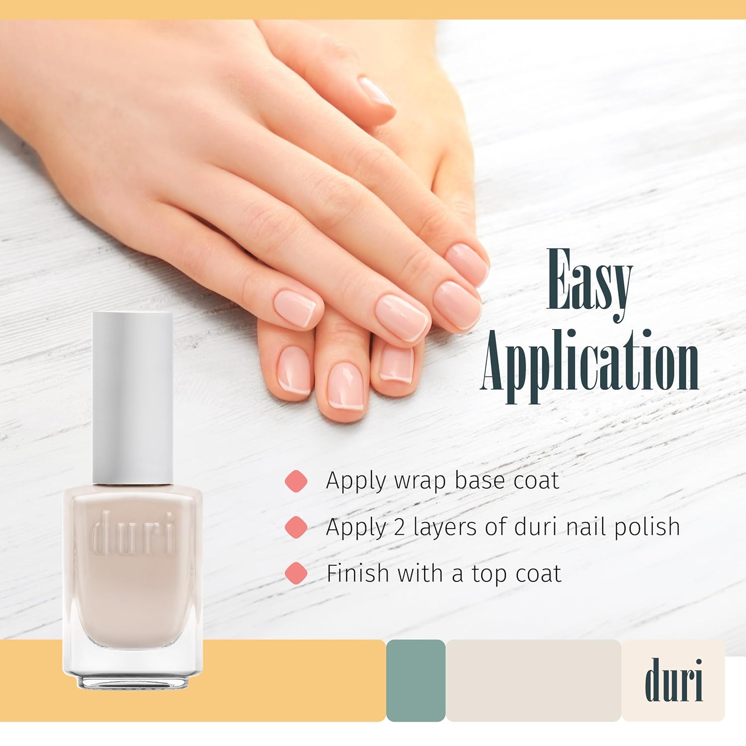 - Hemp base coat - duri’s wrap base coat is fortified with tiny nylon fibers that form a strengthening matrix upon application. This duri base coat is infused with hemp extract rich in vitamins C, B, A, and E, which helps to strengthen nails and soften cuticles.