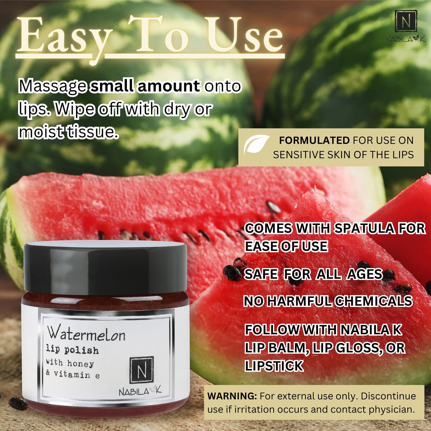 Nabila K Lip Polish with Honey and Vitamin E, Lip Scrub for the Holidays, Watermelon Sugar Scrub, 1 oz