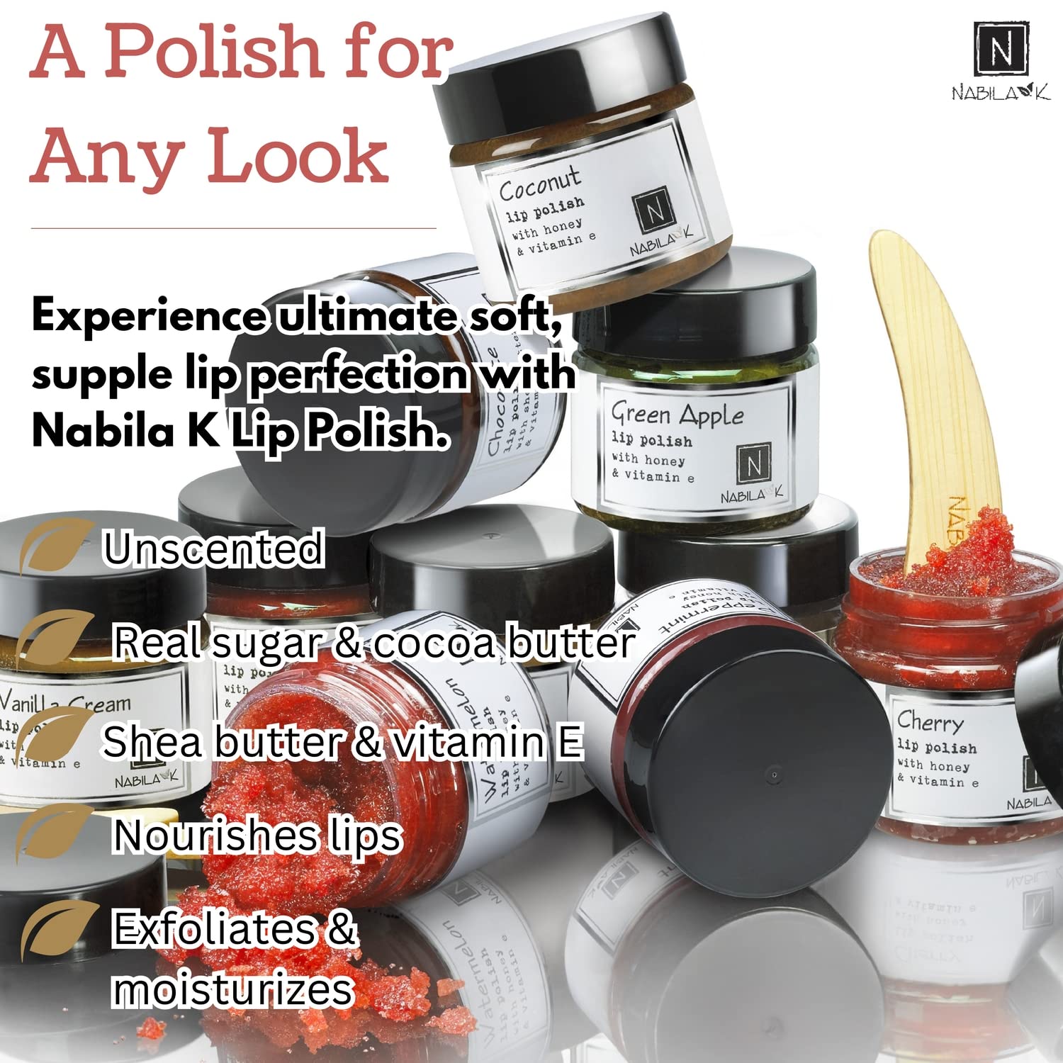 - Nabila K Brown Sugar Lip Polish is a natural, sugar-based lip polish scrub for dry lips. A lip exfoliator made with nourishing, real ingredients like brown sugar and honey to smooth lips, leaving them feeling super soft. Sloughs off dry skin and flakiness to reveal beautiful, healthy lips.