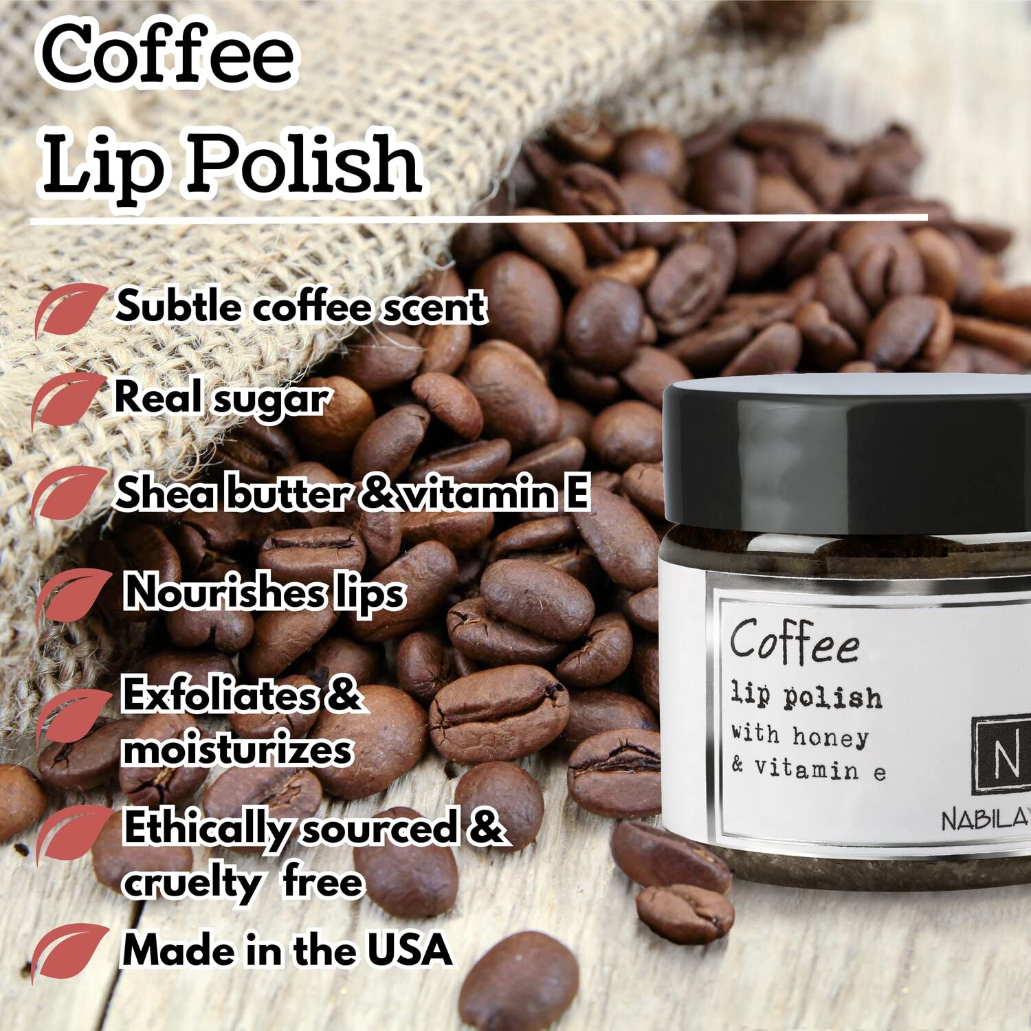 Coffee Lip Polish, 1 oz by Nabila K - Hydrating Lip Exfoliator & Moisturizer with Honey and Vitamin E for Dry and Chapped Lips - Cruelty-Free, Real Sugar, Made in USA