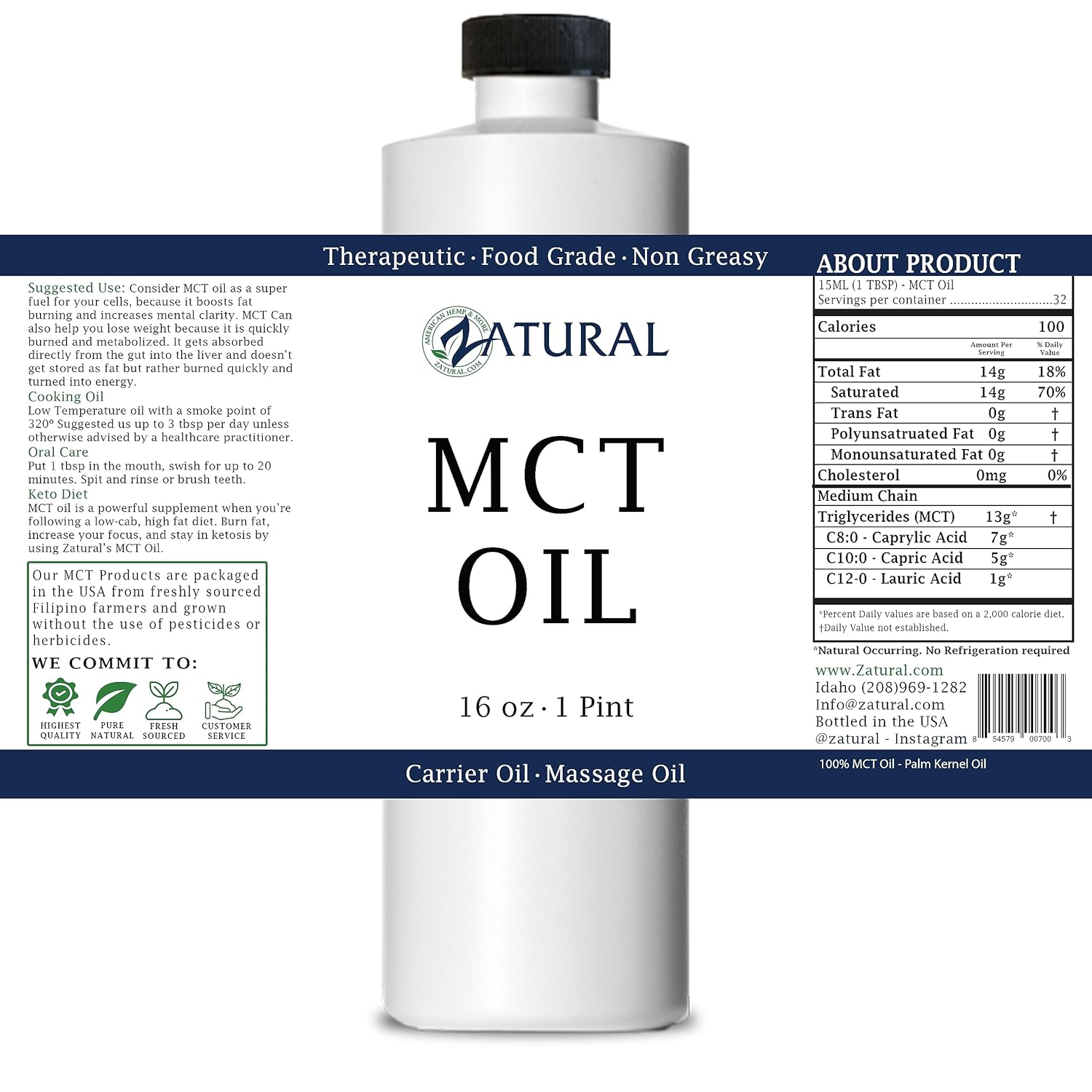 - 100 % PURE MCT: Our oil is 60/40 and colorless, and virtually odorless, and is a liquid at room temperature. Zatural products are free from harmful additives and fillers.