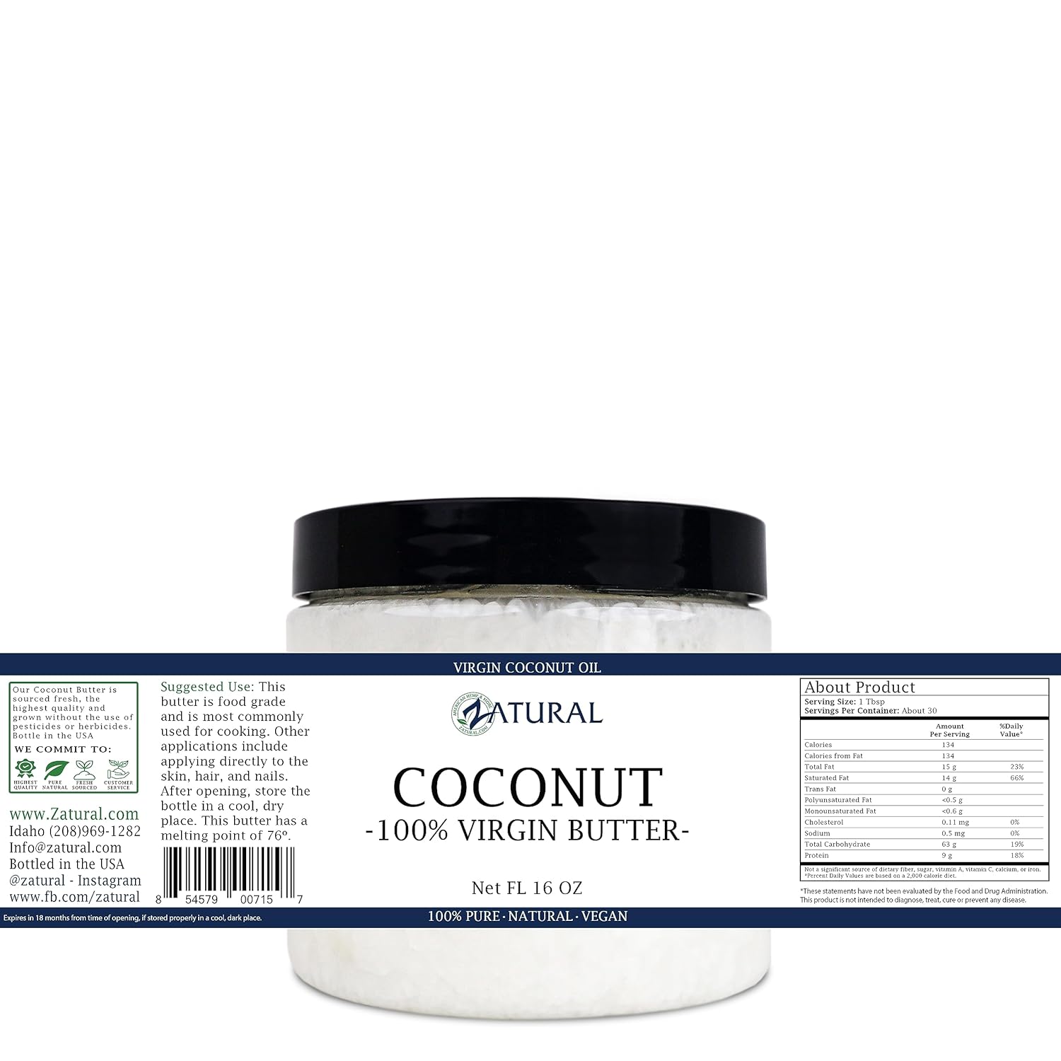 Zatural Coconut Oil, 100% Virgin Organic Extra Virgin Unrefined, Cold Pressed, 8 Pounds (16 Ounce)