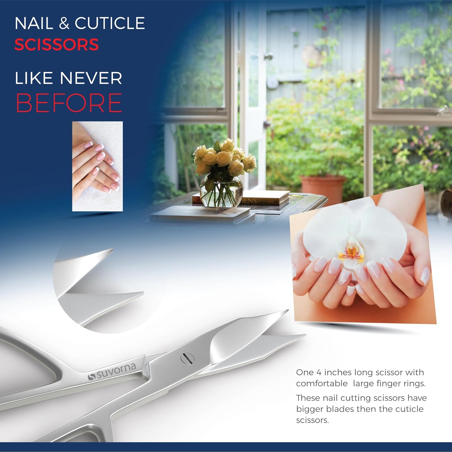 - β ALL-IN-ONE COMPLETE MANICURE KIT: The Suvorna manicure kit contains multiple nail care tools, ranging from cuticle pushers to nail clippers, ideal for use at home, spas, & salons. This manicure kit includes 5 essential nail tools, including a 4" toenail clippers/cuticle trimmer, 3.75" nail scissors, fingernail cleaner for under nails, cuticle pusher, slant tip tweezers, and nail file, it empowers you to achieve flawless nails of all types making it ideal nail kit for women and men.