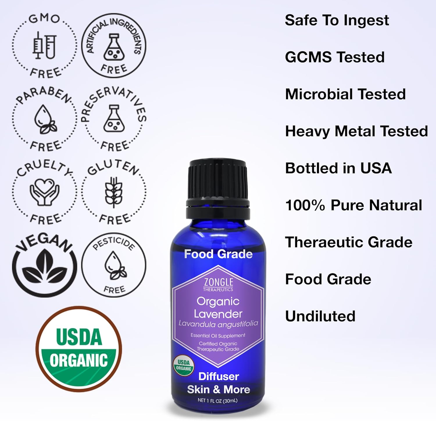Organic, Lavender Essential Oil, Food Grade, for Drinks, Skin, Hair – 100% Pure, Lavender Oil, by Zongle Therapeutics, 1 OZ