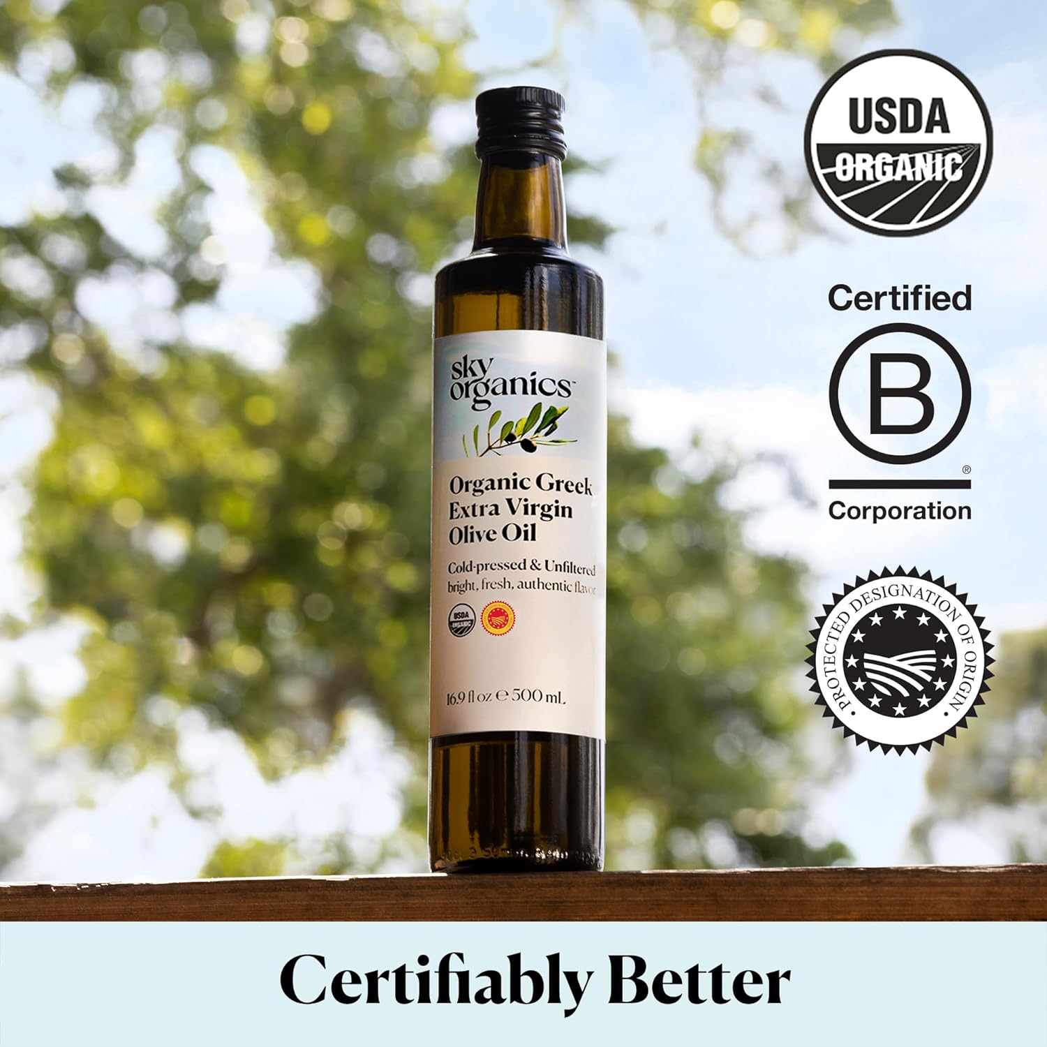 Sky Organics - Organic Extra Virgin Olive Oil, 16 fl oz - Cold Pressed & Unfiltered - Bright, Fresh, Authentic Flavor - Sourced from Farmers in Greece - 100% Pure - Kosher - Natural, Vegan, & Soy Free