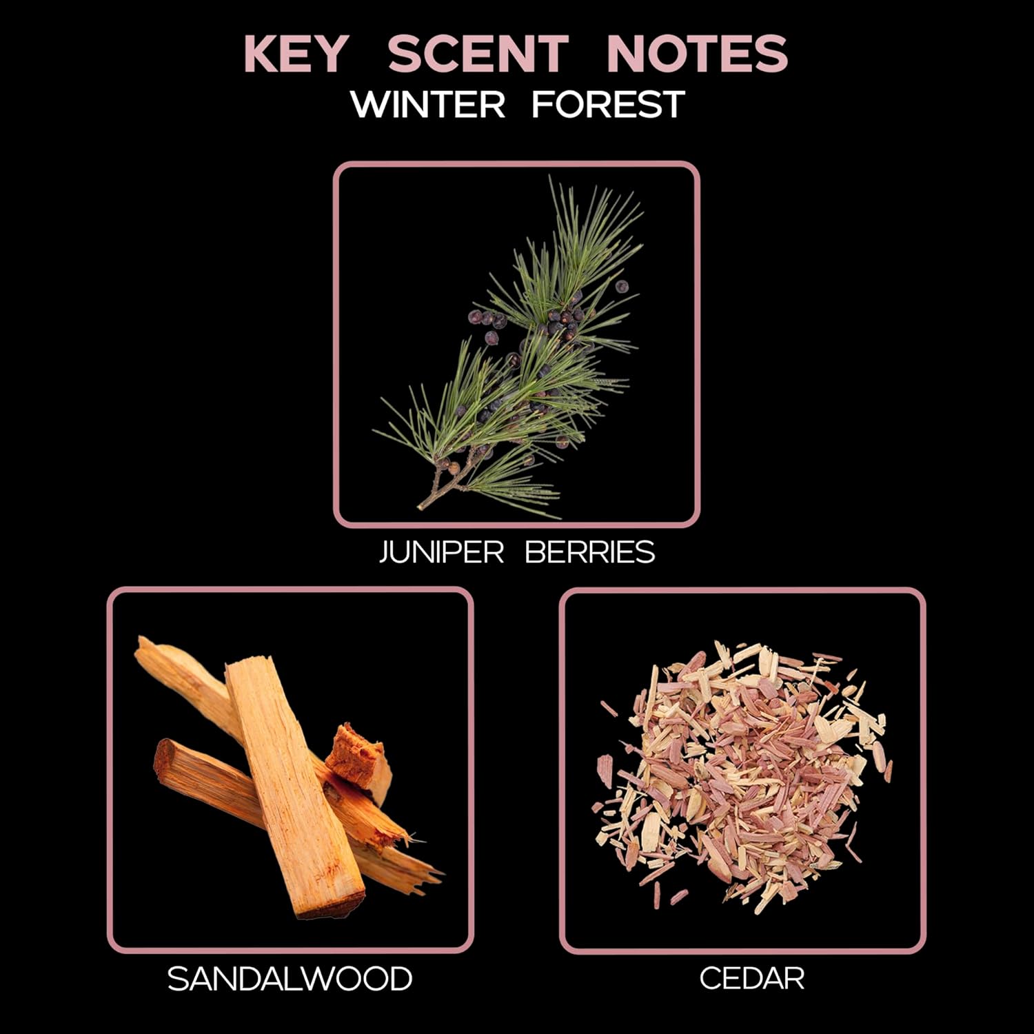 - WINTER FOREST – evokes a classic woodland scent of Fraser Fir, Pine Needles, Juniper, Sandalwood, and Cedarwood; the Bell Diffuser with a deep forest green ribbon accent and rustic greenery offers a cozy holiday touch; blends seamlessly with pine and wood-toned décor.