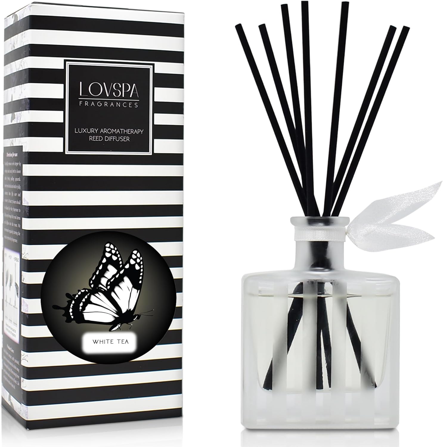 LOVSPA Reed Diffuser Set, White Tea Scented Oil Diffuser with Sticks, Home Fragrance Accessories for Bathroom Shelf Decor, Aroma Diffusers for Home or Office Desk, USA Made