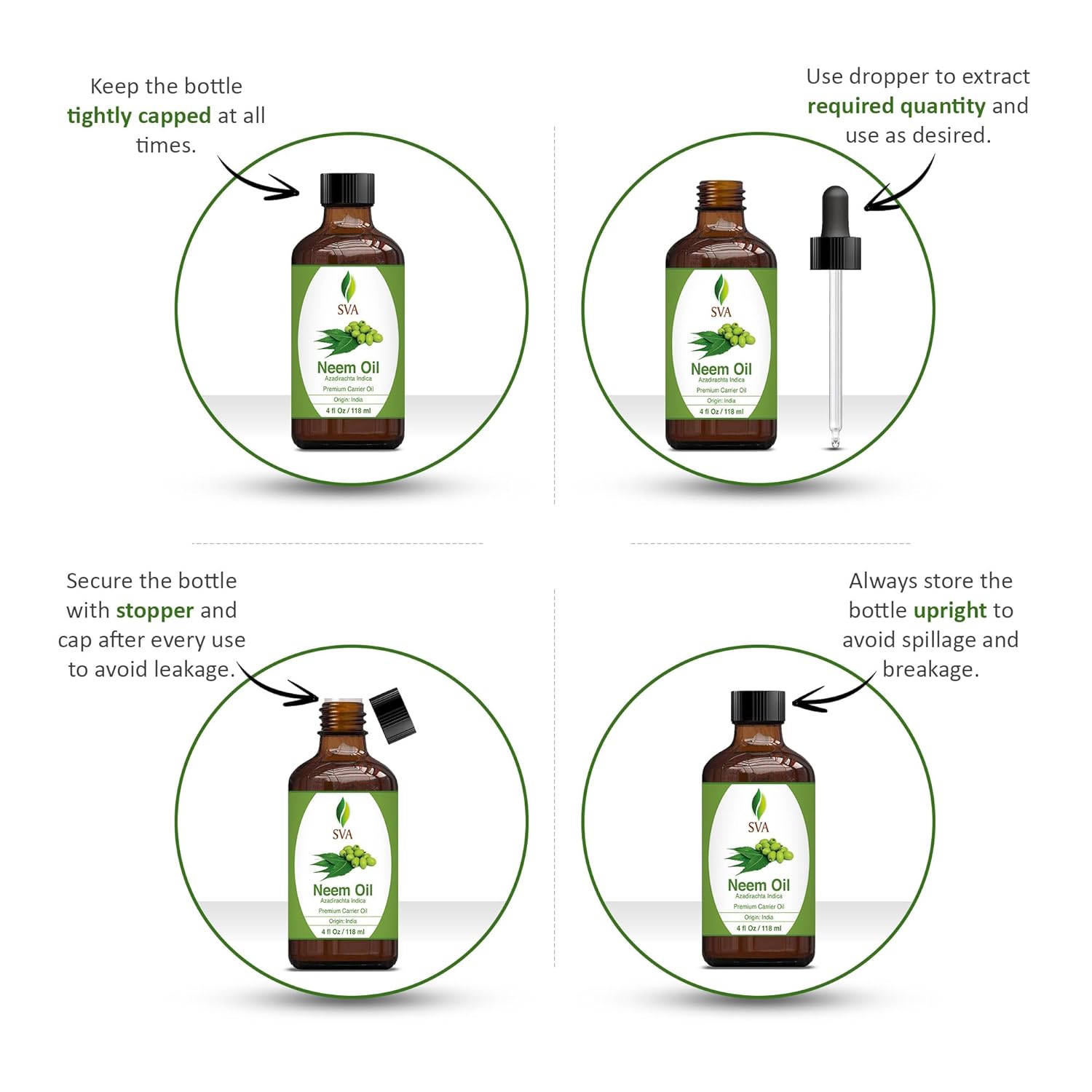 - How To Use: SVA Neem Oil, cold-pressed, is easy to use. Pour a few drops on your palm and gently massage your scalp and skin with it for a few minutes. Leave it for some time and wash it off with a mild cleanser. You may use cold-pressed Neem oil for hair or skin and leave the oil overnight for better results.