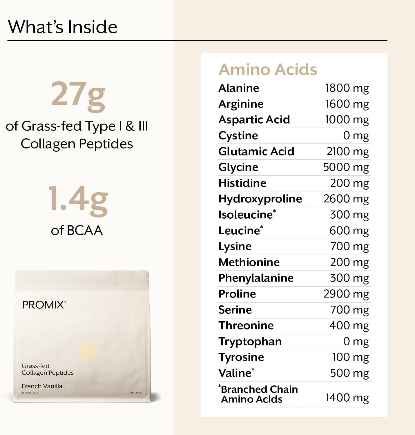 - Best for Skin, Bones, Joints, and Recovery Support: Promix Collagen Peptides are hydrolyzed type 1 and type 2 bioactive collagen peptides from grass-fed cows. This lightly sweetened and smooth powder contains hydroxyproline and proline to support cartilage and tendons, and glycine to aid gut health.