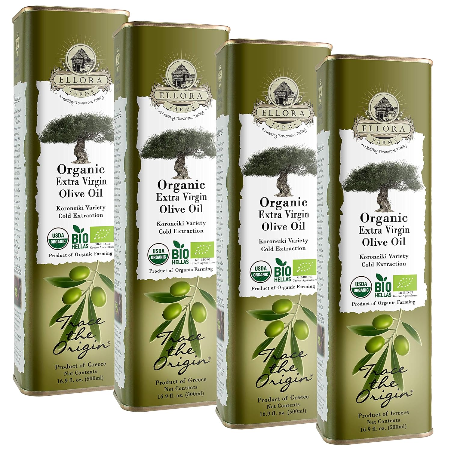Ellora Farms, USDA Organic Extra Virgin Olive Oil, 2024 Harvest, Gold Award, Unfiltered, High Oleocanthal, Kosher 17 oz tin, Pack of 4