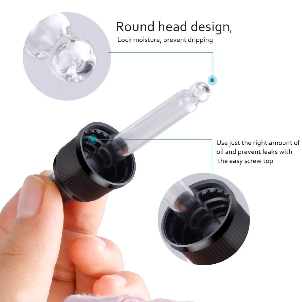 - Easy to Use: Smooth rounded dropper bottom for gentle ease of use. Use just the right amount of oil and prevent leaks with the easy screw top. The eye droppers make it easier to measure the correct number of drops