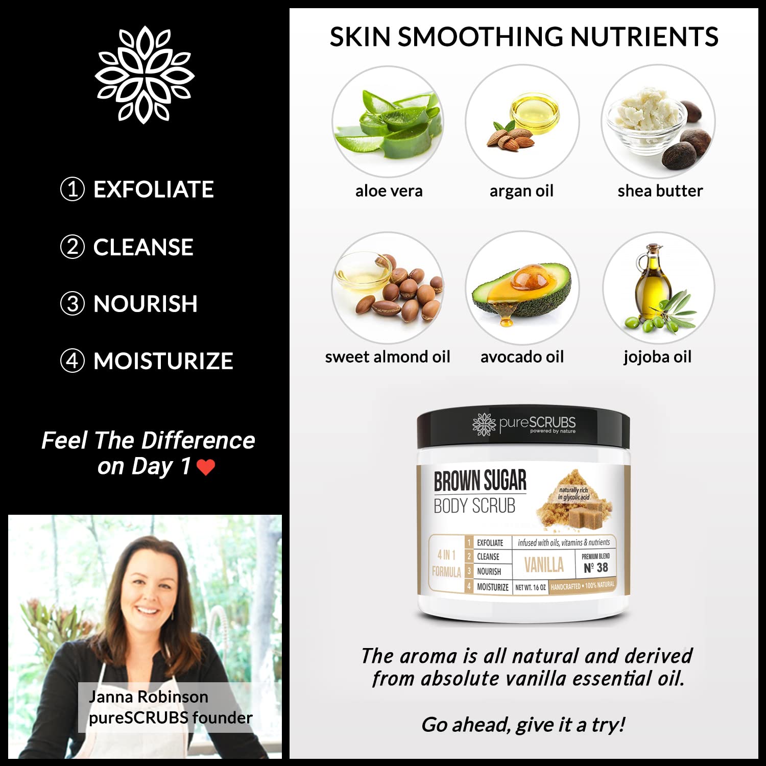 - GET ULTRA SMOOTH SKIN FAST - THIS WORKS! Our unique “4 in 1 Formula” does everything a body scrub should do and more. Pure brown sugar crystals infused with essential oils, nutrients and skin softeners helps to smooth away rough, bumpy, and uneven textures to instantly reveal your true soft, healthy and radiant skin. You will love the vanilla aroma!