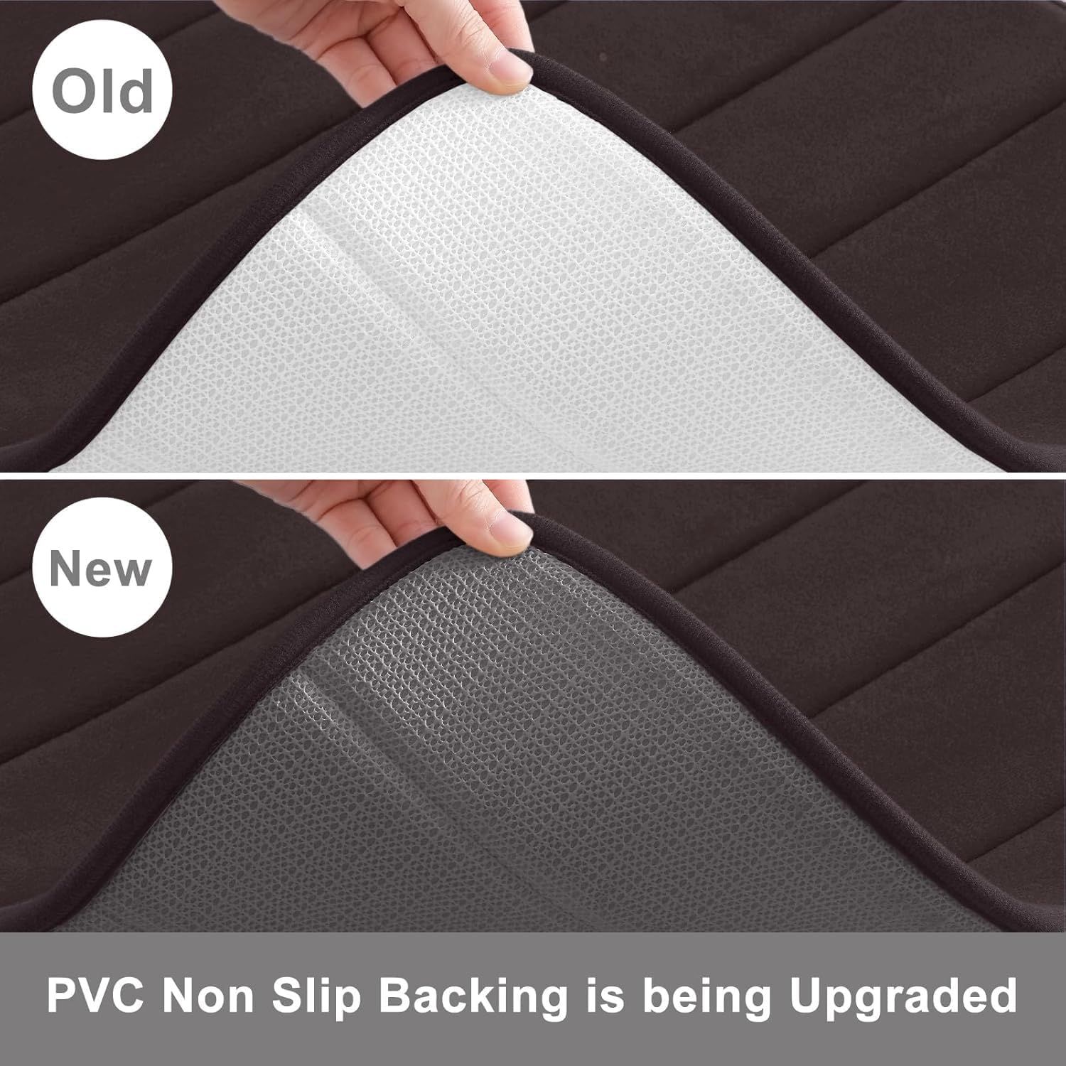 - NON-SLIP PVC BACKING: Bathroom mats feature a non-slip mesh back to prevent the mat from shifting and skidding, and the rubber back prevents water from seeping to the soft surface. WARNING: Place mat on CLEAN DRY SMOOTH FLOOR only. Water under bath mats can cause it to slip. Keep bottom of mat dry. Before using bath carpet, test with foot to ensure it doesn't move