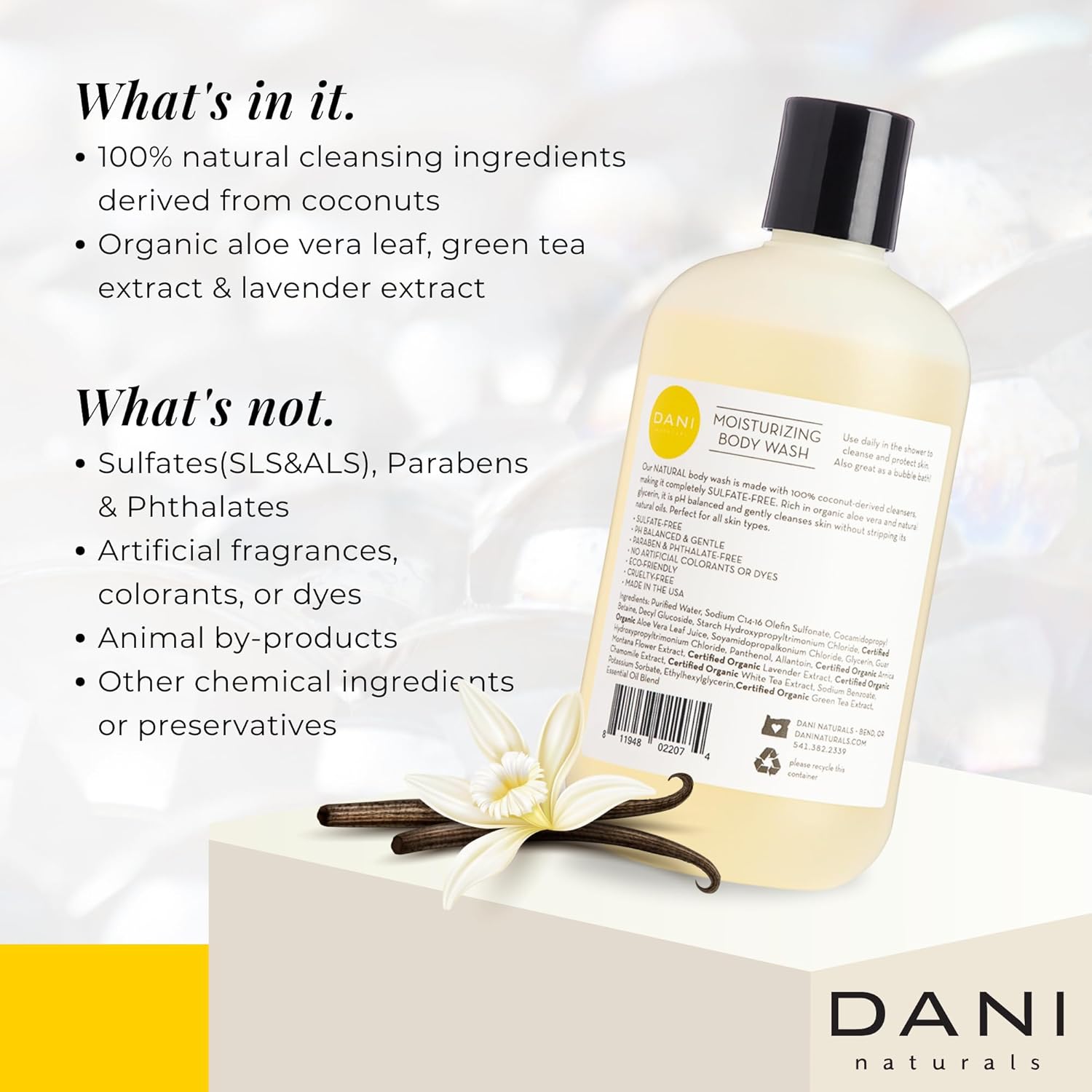 - β Gentle & Suitable for All Skin Types: DANI Naturals Body Wash is carefully crafted with a pH-balanced formula and coconut-derived cleansers that gently cleanse the skin without stripping away its natural moisture. Ideal for all skin types, including dry and sensitive skin, it provides a soothing, irritation-free shower experience.