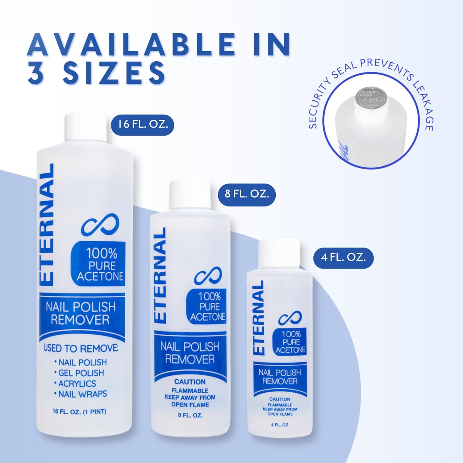 - EXPERIENCE SALON-QUALITY RESULTS: Achieve professional manicure and pedicure results at home with Eternal 100% Pure Acetone Nail Polish Remover. Say goodbye to stubborn and tough glitter, gel, acrylic or any nail polish, and leave your nails ready in record time!