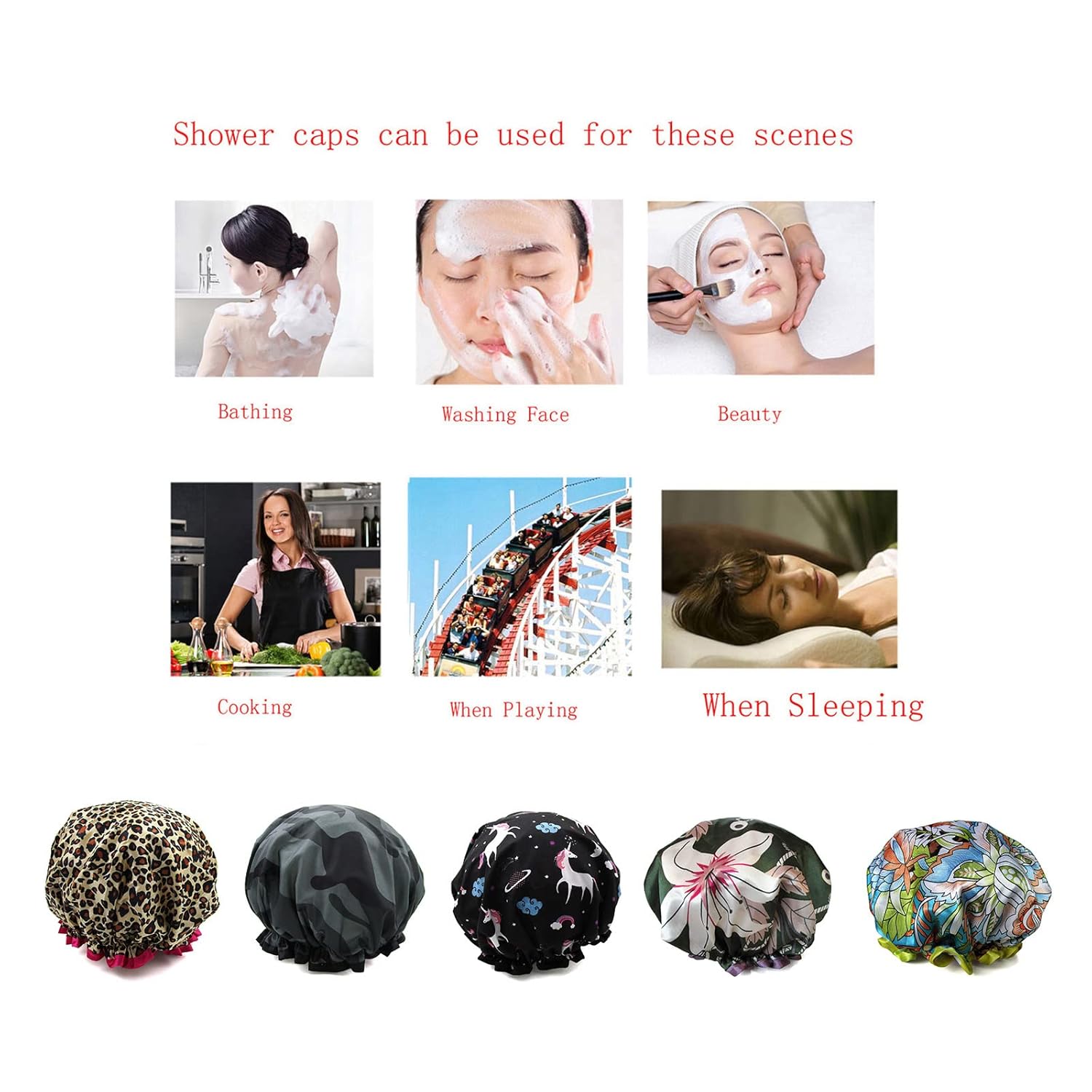 - Widely Occasions: These shower hats fit you during showering, cooking and SPA.Bath caps can be used to hold your hair and avoid accidental snags when making up, cleaning face, dressing, etc.Help you make the most of your time.It is well worth your while to purchase!