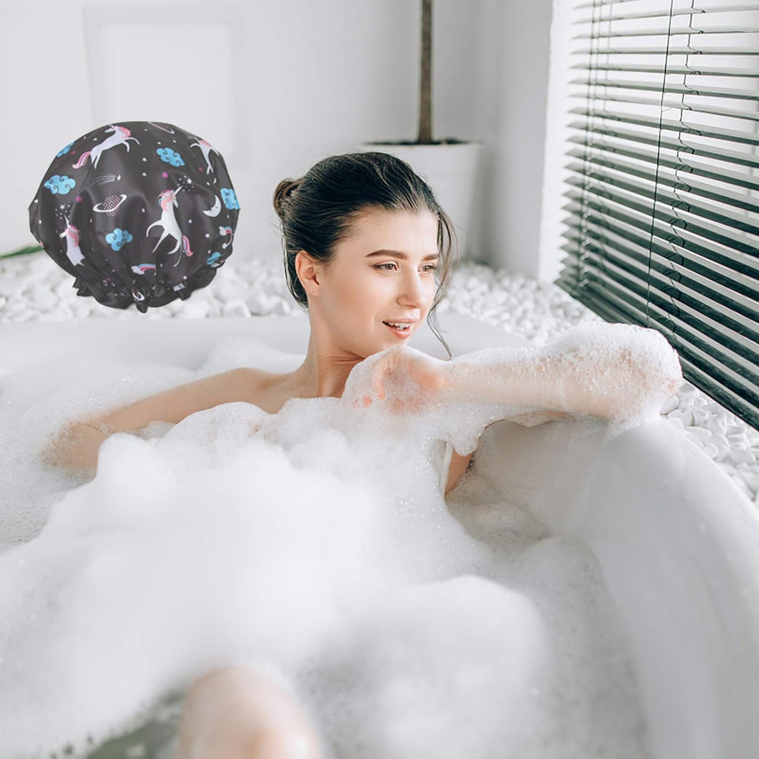 - Practical and Comfortable: Shower cap reusable,it's made of PEVA soft satin,comfortable touching feeling, double layers,waterproof, effectively keep your hair dry while you showering .