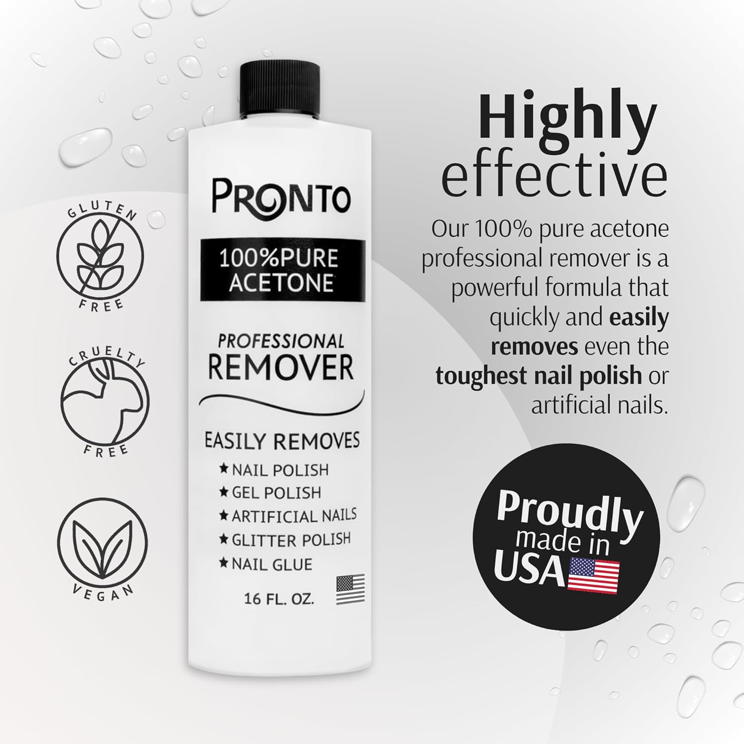 - PREMIUM QUALITY PRODUCT: Our Pronto fingernail polish remover is proudly made in USA, using 100% pure acetone to effectively and efficiently remove all types of manicure and pedicure. Products are sealed, and are available in 4, 8 and 16 Fluid Ounces.