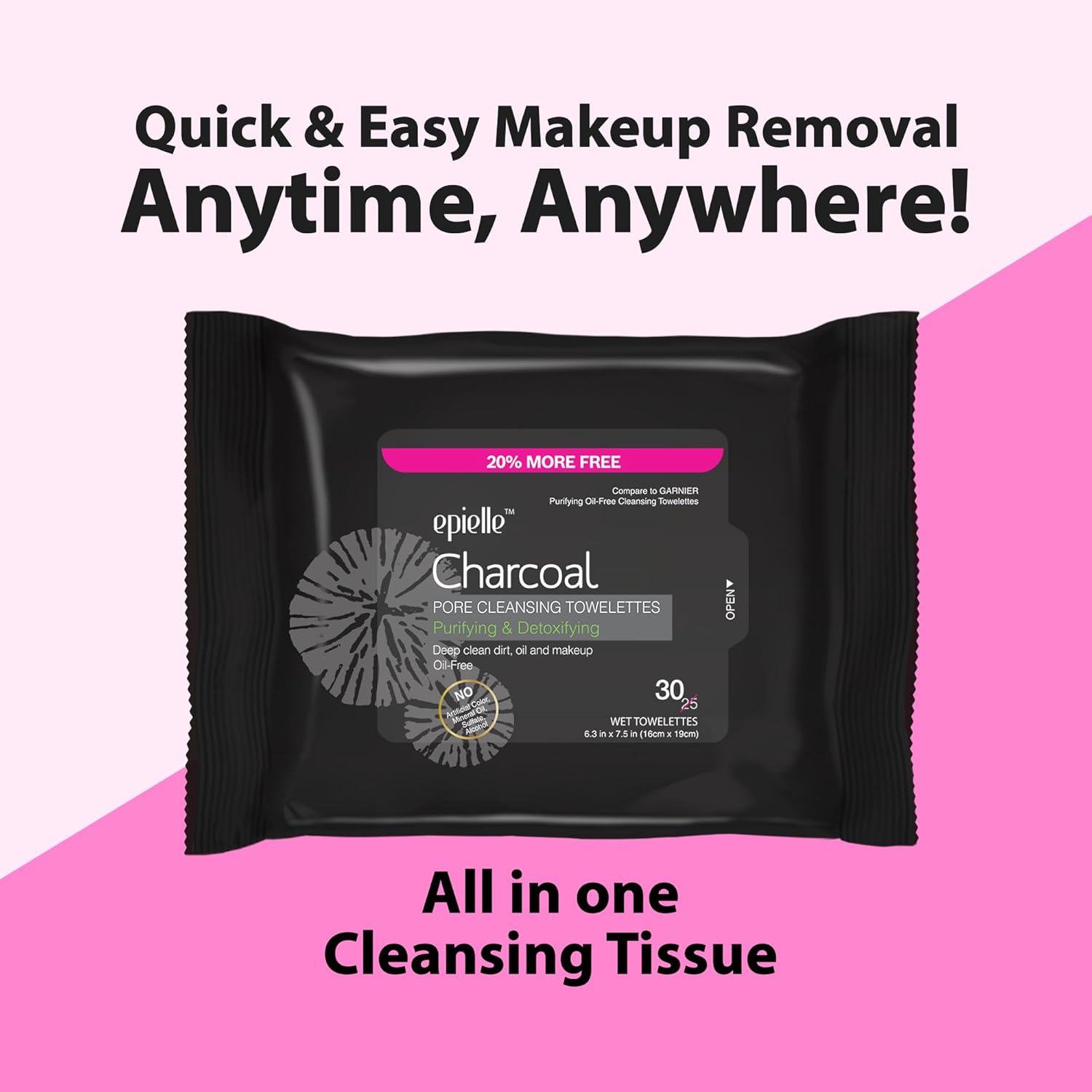 Epielle Charcoal Makeup Remover Wipes, Purifying & Detoxifying, Pore Cleaning Facial Cleanser Towelettes, Remove Dirt, Oil, Waterproof Mascara, Hypoallergenic & Alcohol-Free, 30 Count (Pack of 2)