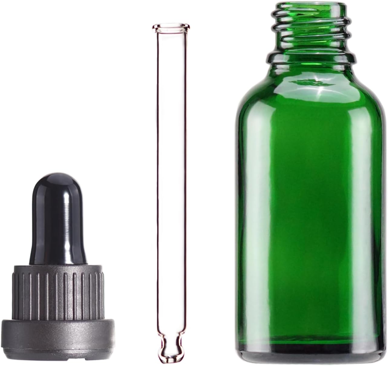- [Glass Bottle with Dropper 1oz] Eye Dropper Bottles glass is green, it designs to protect the essential oil against UV rays. Made from high quality glass.BPA FREE.Refillable, washable and travel friendly. leak proof
