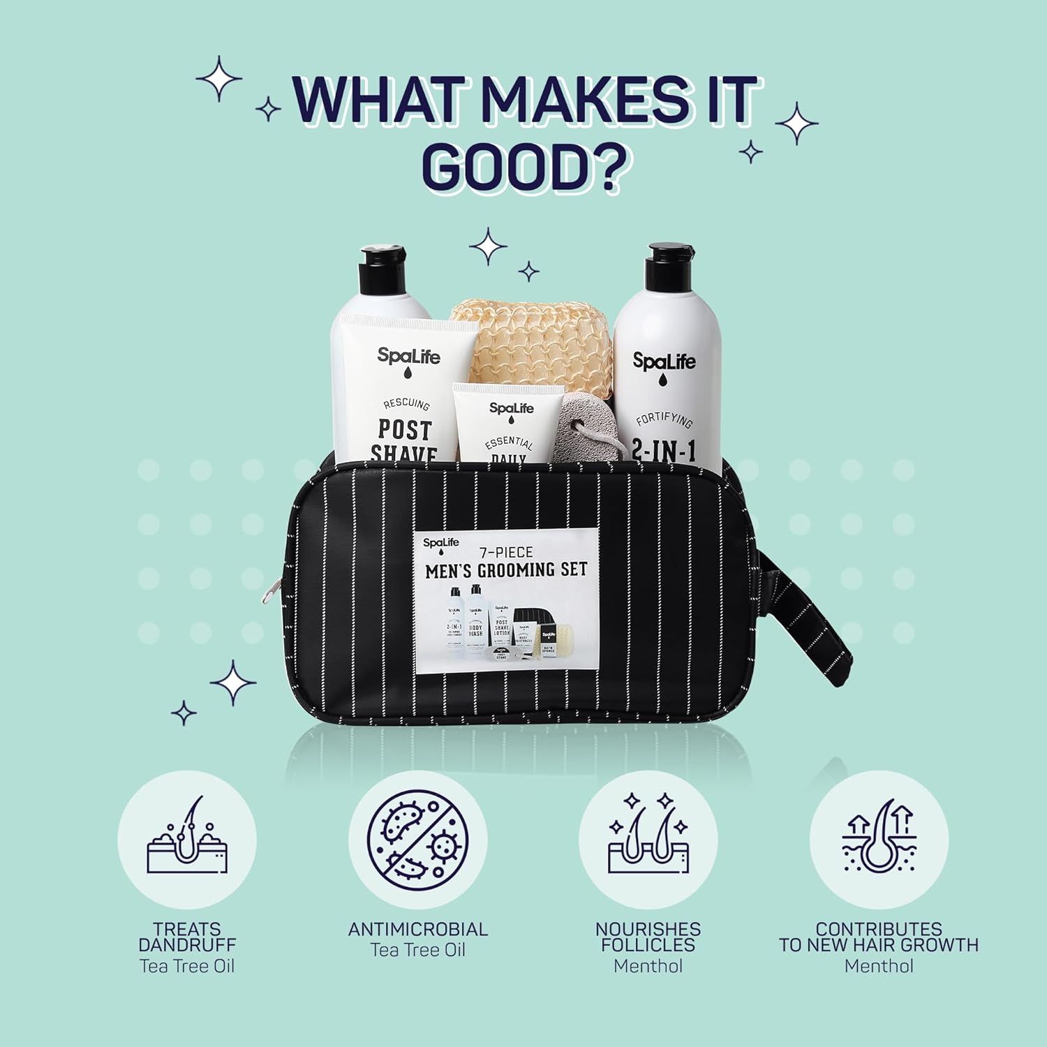 SpaLife 7-Piece Bath and Body Men Grooming Gift Set - 2-in-1 Shampoo & Conditioner, Body Wash, Daily Moisturizer, Post-Shave Lotion, Bath Sponge & Foot Stone for Luxurious At-Home Spa