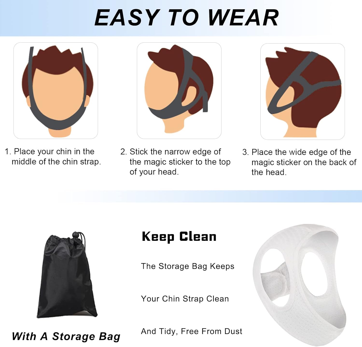 - EASY TO USE: Forzacx chin band uses adjustable, powerful non-stick hair magic stickers, simple and intuitive to wear, please refer to the size chart to determine if it fits your head circumference.No odor did not leg color that also means it wonโt leave stains on your nice white pillows.