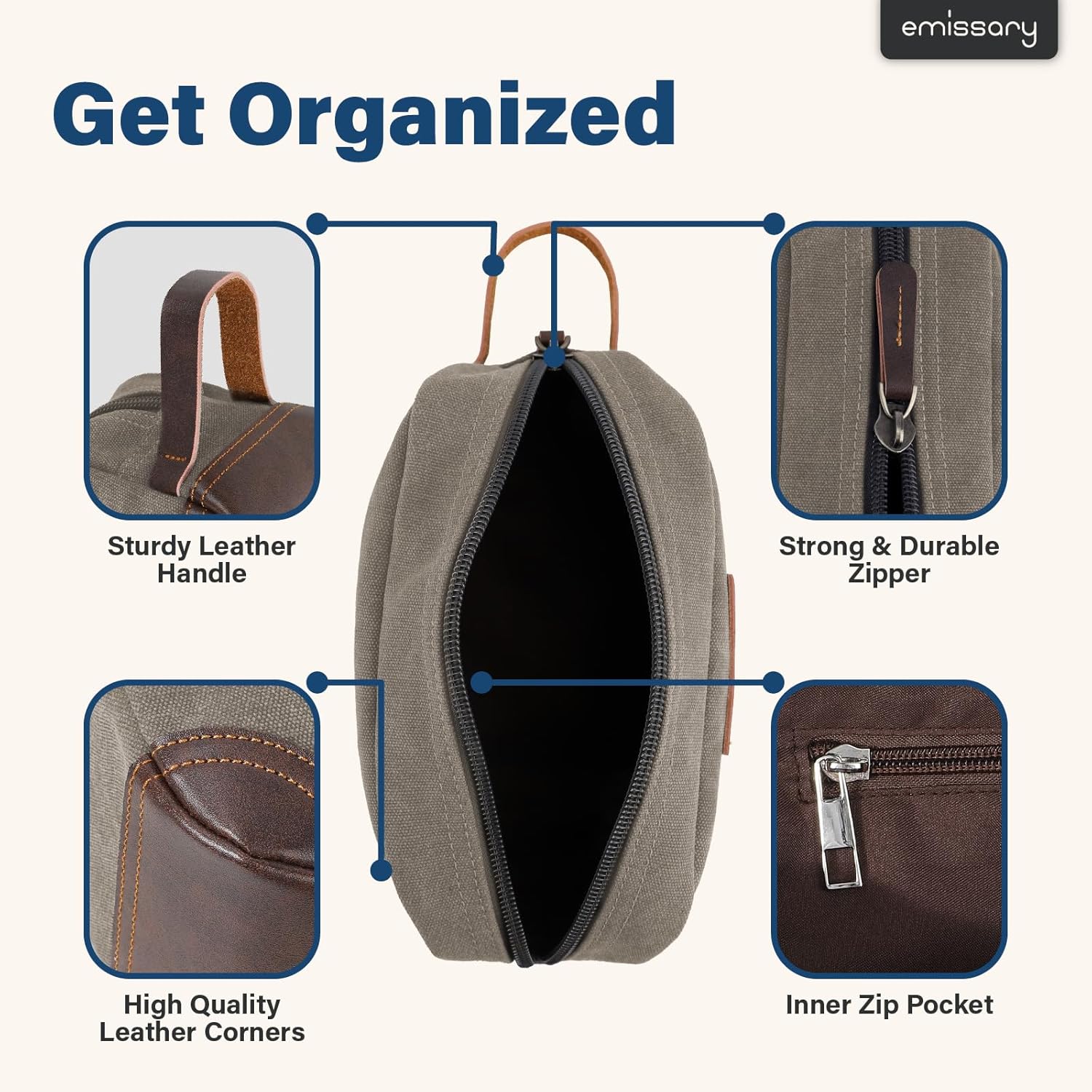 - HIGH-QUALITY DURABLE MATERIAL: This exceptional toiletry travel bag by emissary is made of canvas and PU leather, which is known for its lightweight yet durable qualities, the perfect combination for traveling. This specific material is water resistant, making it safe for use in environments where it may become wet. Making this the perfect bathroom bag, shaving bag, and travel dopp kit.