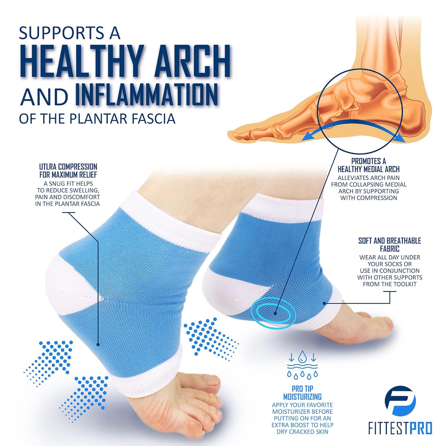 - THE AVERAGE PLANTAR FASCIITIS COMPRESSION SLEEVE DOES LITTLE TO RELIEVE PAIN, OFTEN CUTTING OFF CIRCULATION & CAUSING BLISTERS. The Fittest Pro 14-Piece Toolkit provides CONSISTENT, STEADY COMPRESSION, relieving arch & heel bone pain for plantar fasciitis, heel spurs & foot strain. Includes Foot Sleeves, Cushioned Arch Supports, Therapy Wraps, Gel Heel Cushions, Silicone Gel Heel Protectors, Fabric Heel Grips & Gel Heel Grips. If you are in-between sizes or have a wide foot please size up.