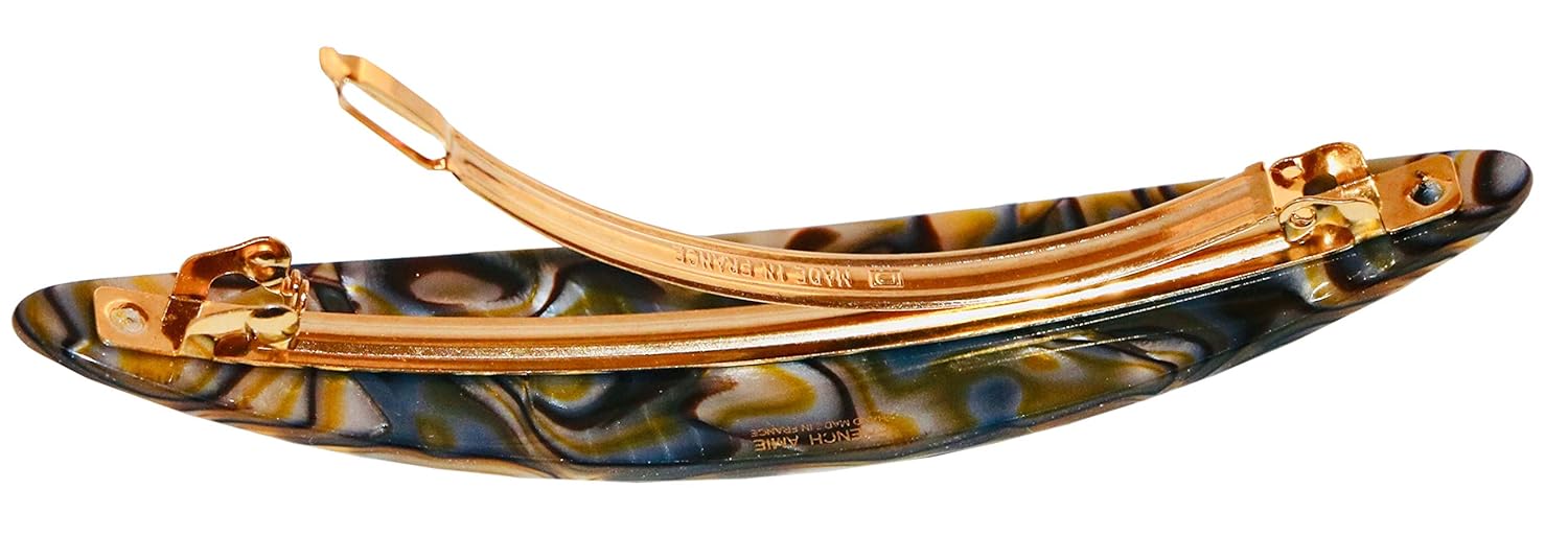 French Amie Long Oval Silver Onyx Grey 4.5" Handmade Celluloid Hair Clip Barrette with Golden Clasp for Women
