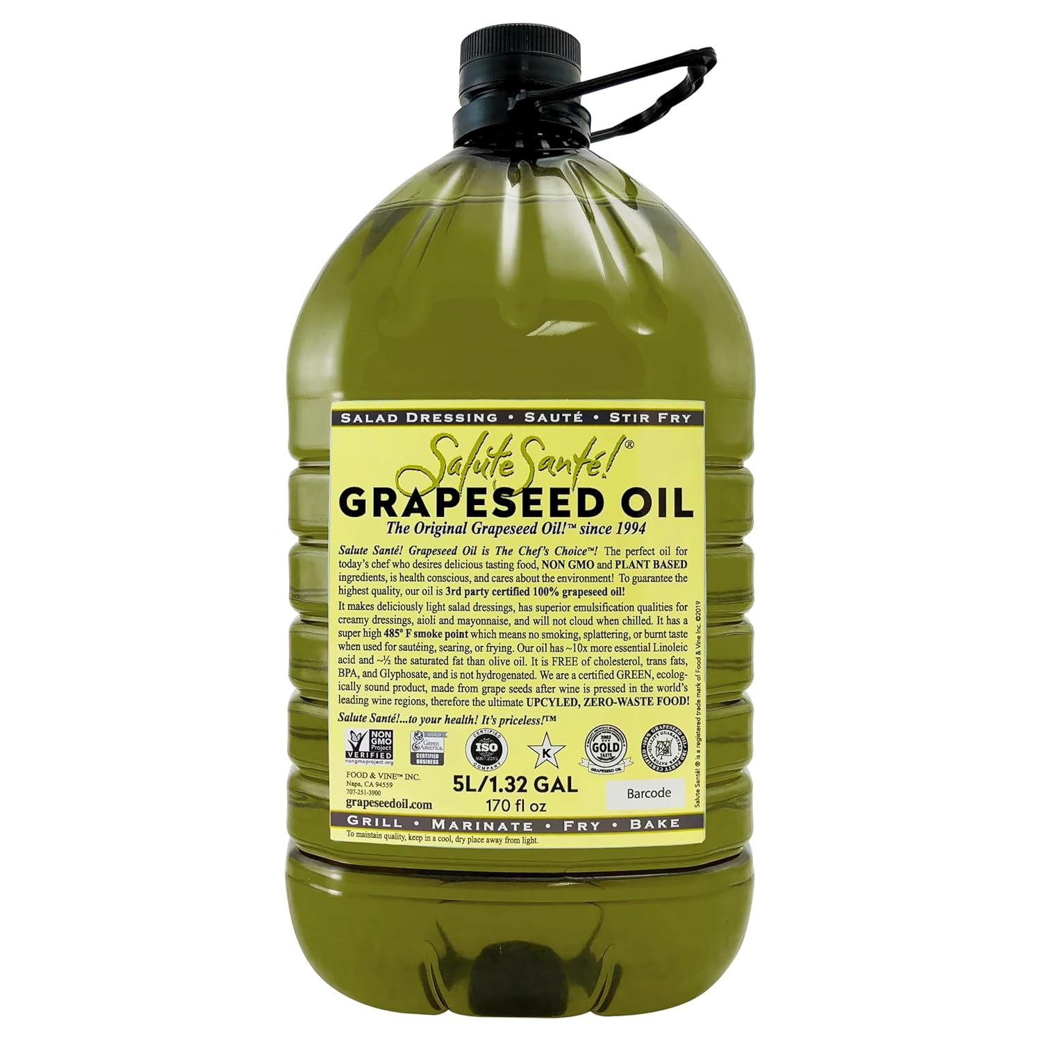 Grapeseed Oil – Cold Pressed & 100% grape oil | “Good Inside and Out” Beauty & Cooking Oil | High-Heat, Non-GMO, Kosher, Vegan | For Skincare, Hair, Massage, Soap & Gourmet Recipes | 5 Liter Jug