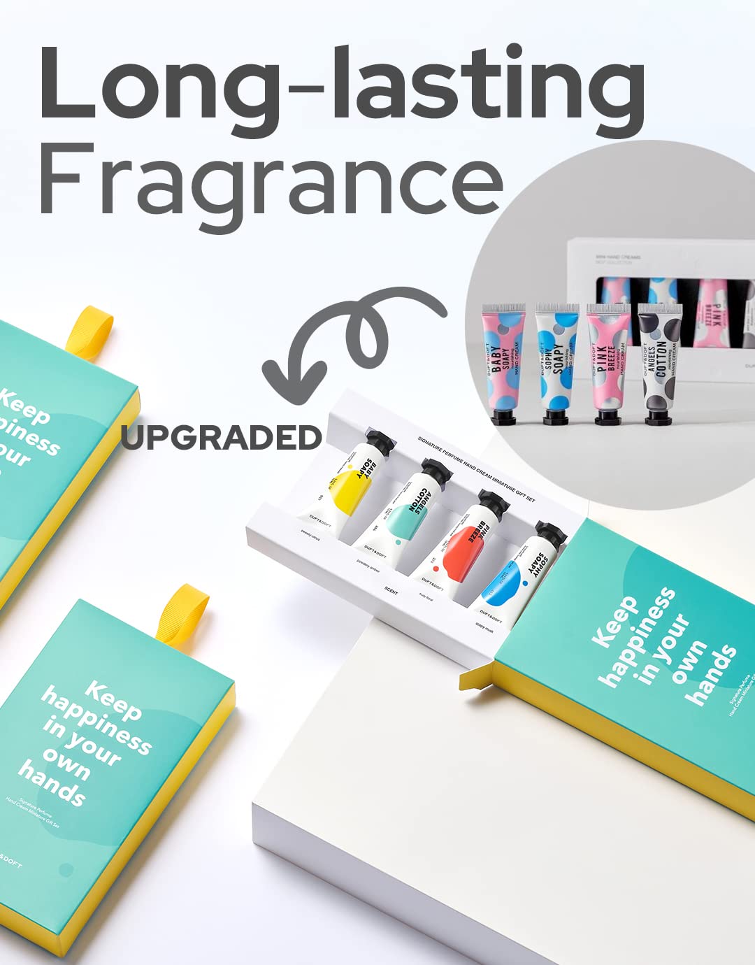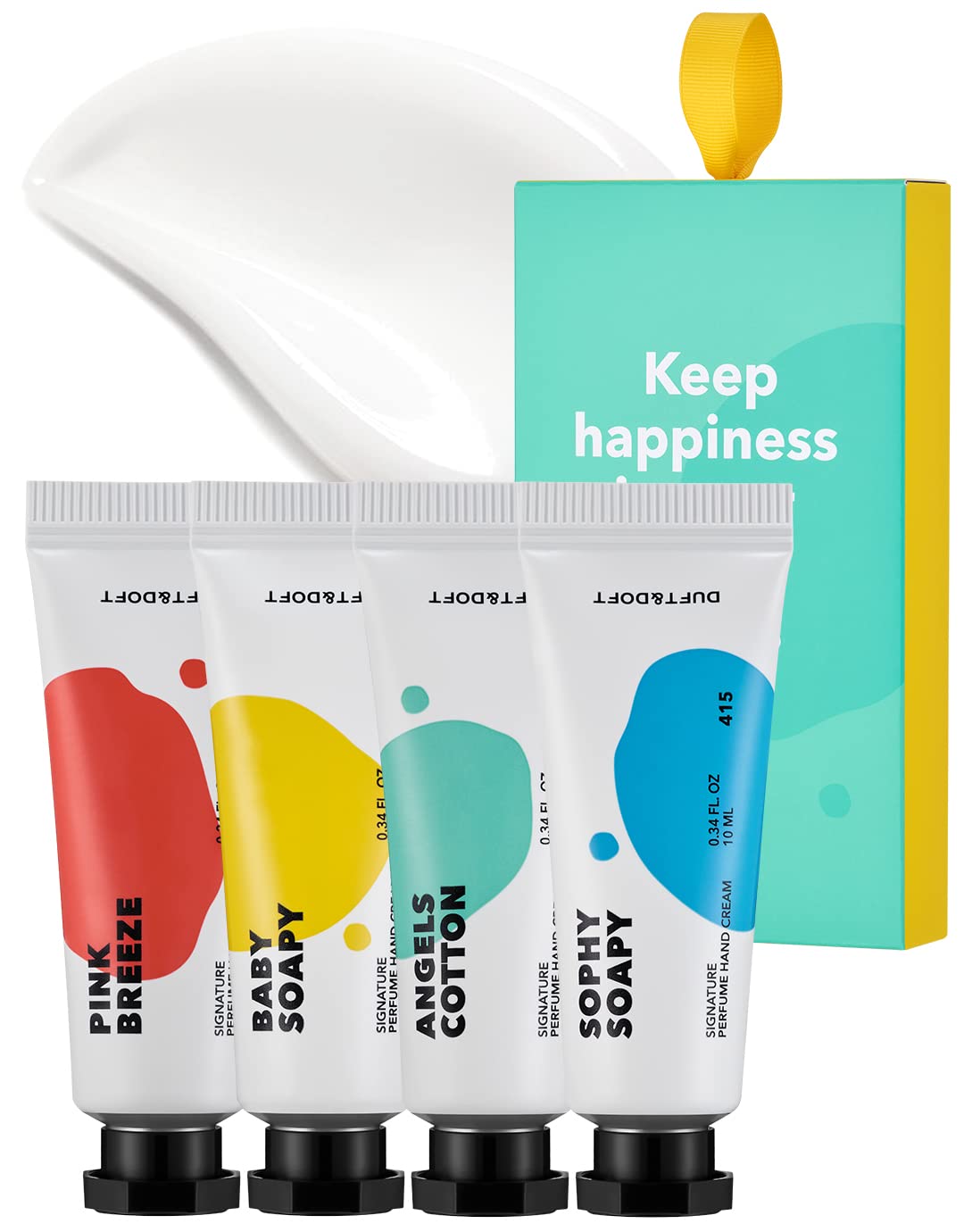 DUFT&DOFT Mini Hand Cream Gift Set - Non-Greasy With Shea Butter & Collagen - Nourishing & Hydrating Scented Cream (Pink Breeze/Sophy Soapy/Angels Cotton/Baby Soapy - Pack Of 4 (0.3 Fl Oz)