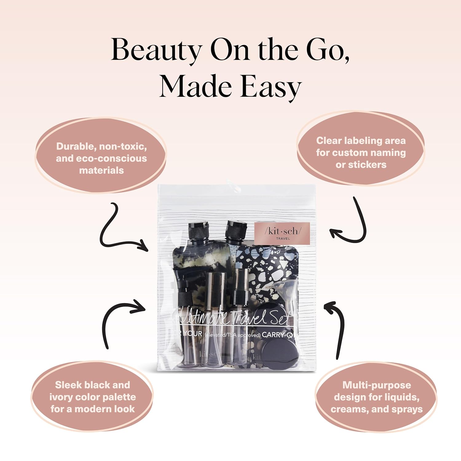 - STYLISH & FUNCTIONAL, BEAUTIFUL AND PRACTICAL TRAVEL BOTTLES - The Kitsch travel kit is not just functional but also stylish, with a sleek and modern design that looks great on your vanity or bathroom counter. Available in an elegant Kitsch pattern and a variety of colors, these travel bottles for toiletries are a fashionable solution to your travel needs—perfect for any beauty enthusiast.