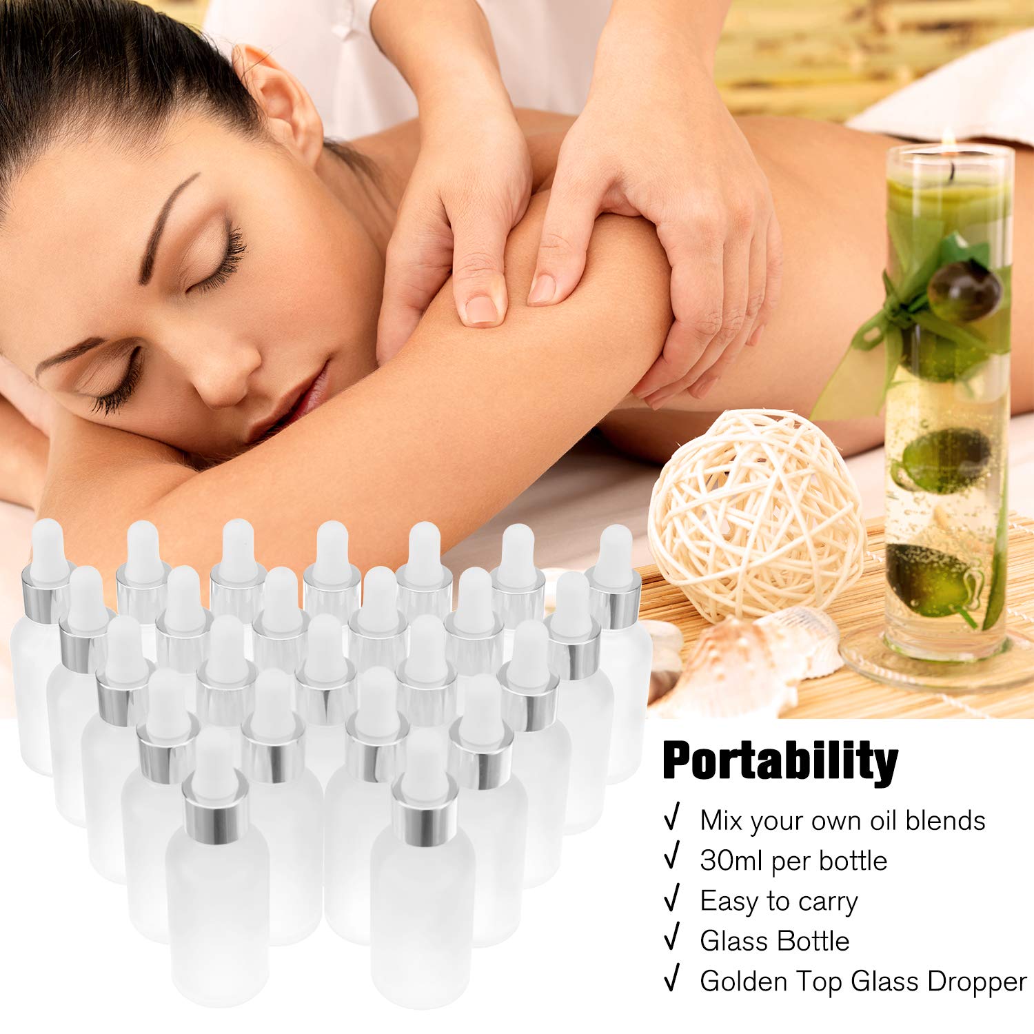 PrettyCare Glass Eye Dropper Bottles 24 Pack, 1oz (30ml) Frosted Empty Thick Bottles Bulk with Leakproof Silver Caps - With Labels & Funnels for Storage, Travel, Essential Oils, Cuticle, Tinctures
