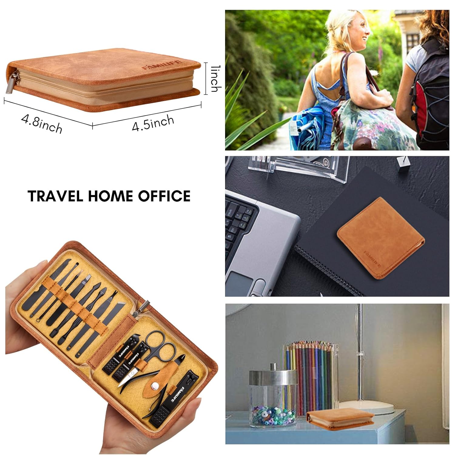 FAMILIFE Manicure Set, Professional Manicure Kit Nail Clipper Set Stainless Steel Pedicure Tools Kit with Leather Travel Case for Women Girl Men (Brown)