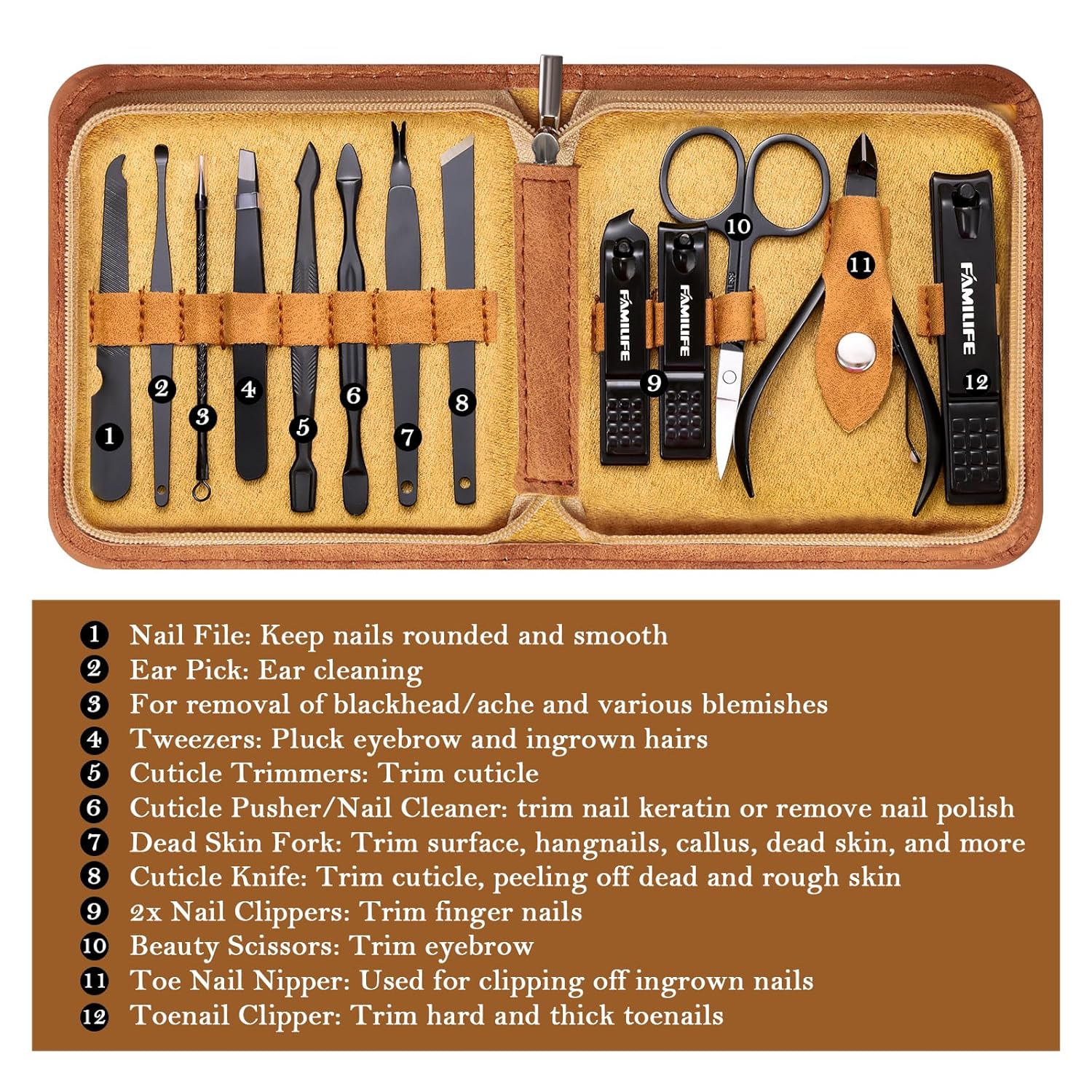 - ▶13 Pcs Stainless Steel Manicure Set - FAMILIFE Professional Manicure Kit contains 13 nail accessories for hand care, facial care and foot care kit. Our stainless steel nail set is high quality manicure set, which is strong and durable, and this nail tools will not fade, extremely hard and sharp. Designed for long-term use. Nail trimmer kit for men is the first choice for successful men and exquisite women