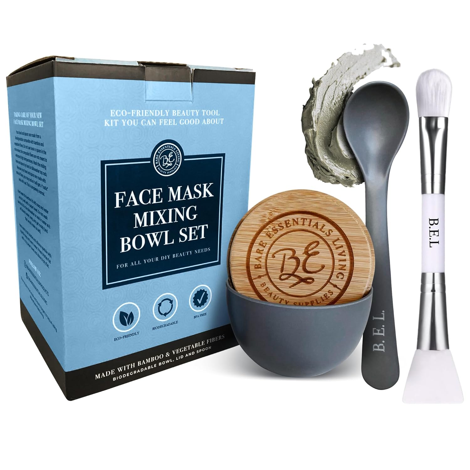 Bare Essentials Living - Clay Face Mask Mixing Bowl Set, Skin Care Kit Facial Bowls with Bamboo Lid, Face Mask Spoon, & Dual Sided Face Mask Brush Applicator for DIY Clay Mask, Facials & Hair (Grey)