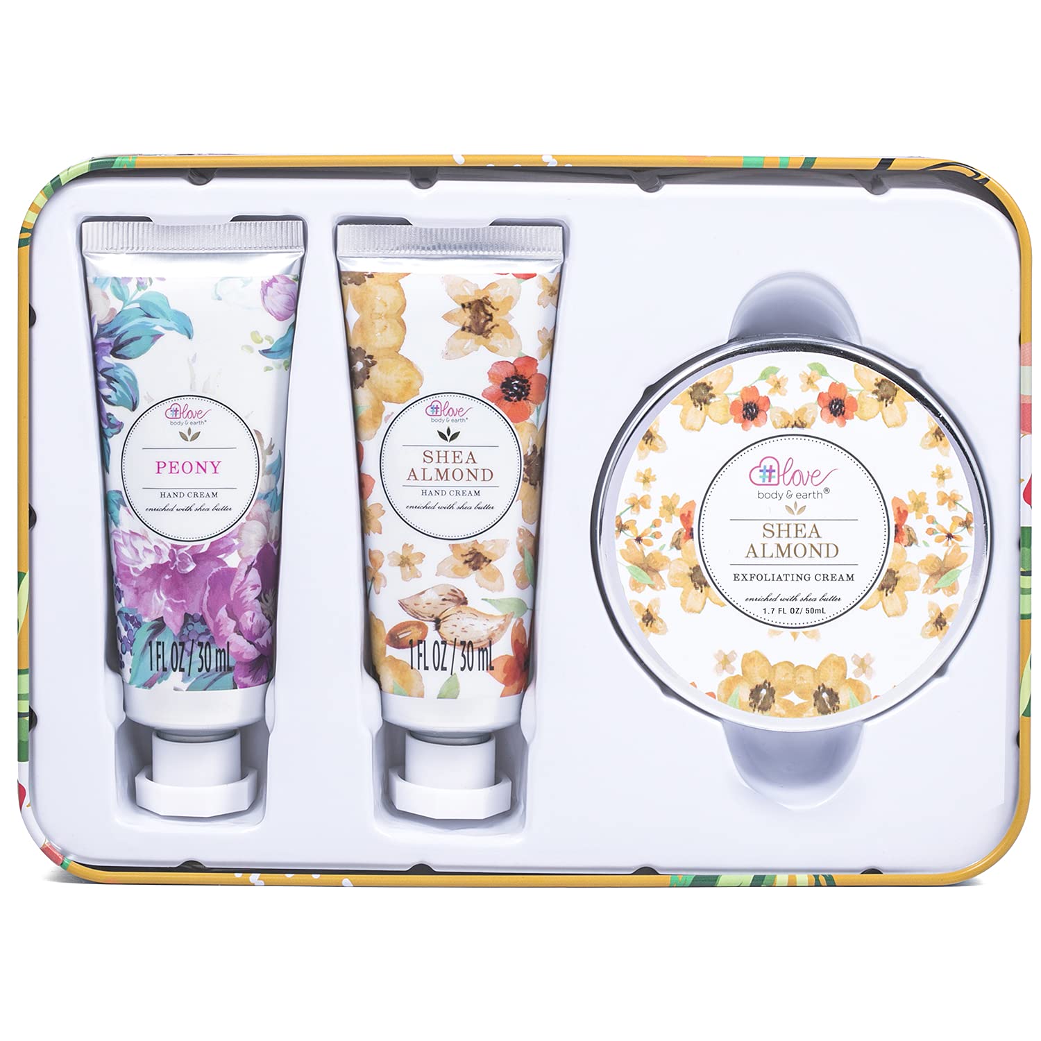 - Natural Floral Fragrances: Your favorite hand care set now in a bundle. Get that soft, glowing and youthful skin with this set of three : peony and shea almond scented hand creams and shea almond scented exfoliation cream. It's triple the delight!