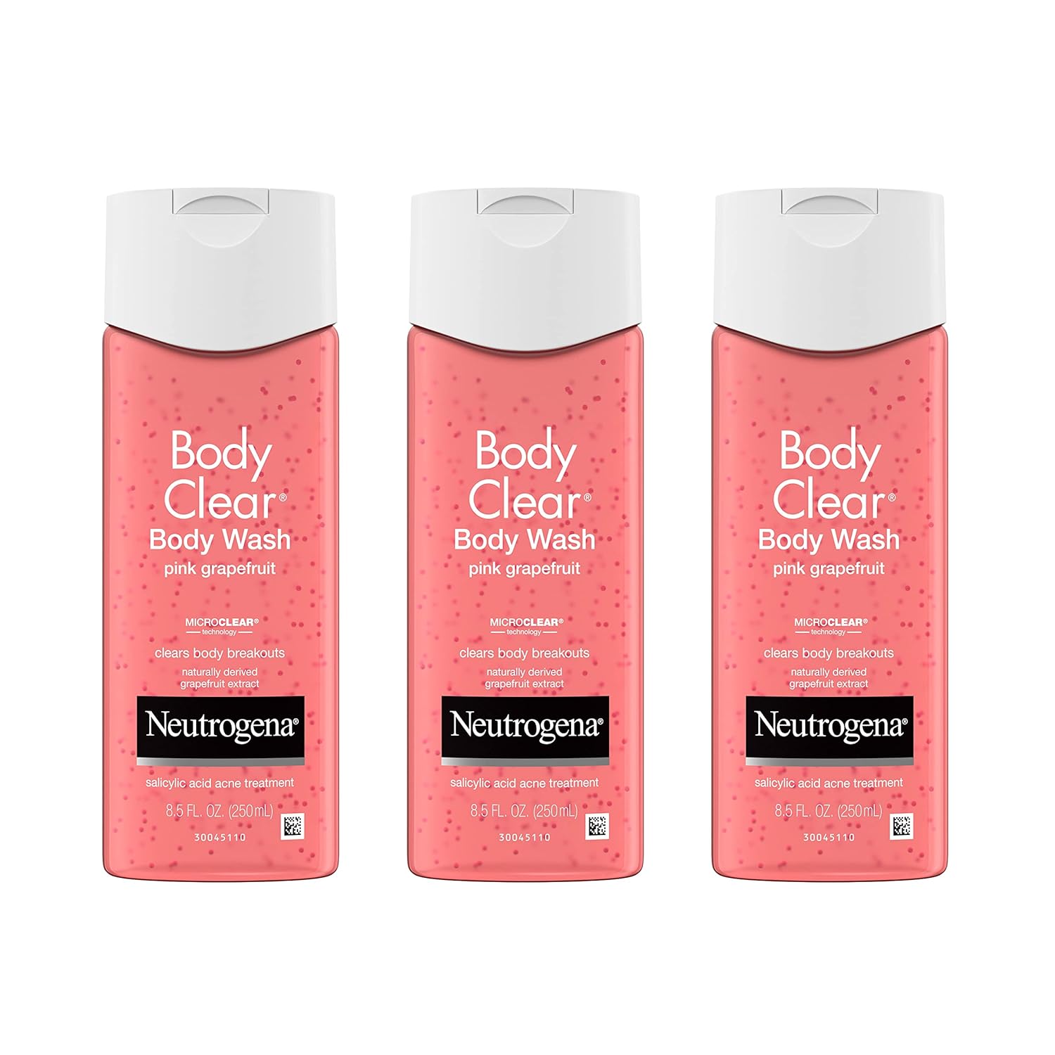 - Three 8.5-fluid ounce bottles of Neutrogena Body Clear Pink Grapefruit Acne Body Wash with salicylic acid acne medication specially designed for acne-prone skin to help treat and prevent acne breakouts