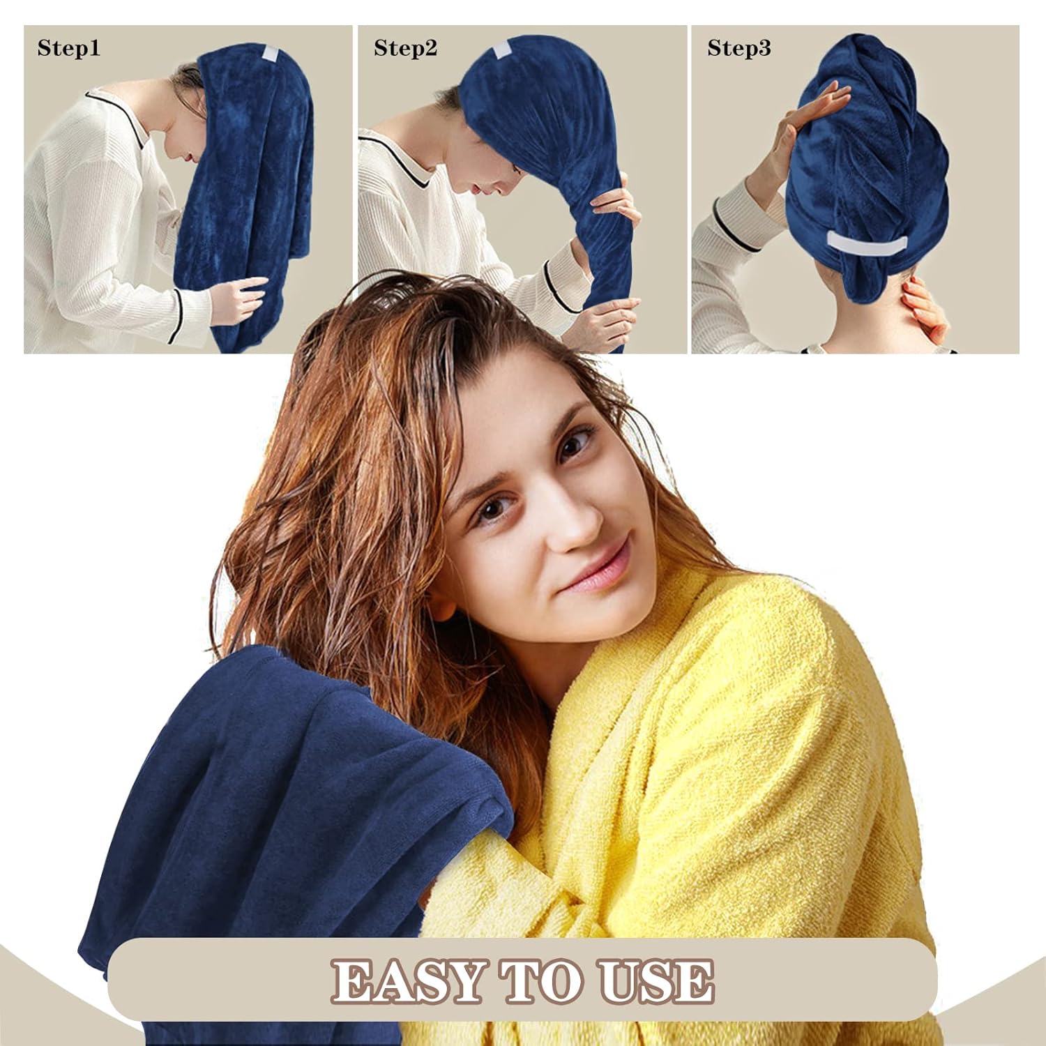 - EASY TO USE:The unique rubber bands design makes the hair towel wrap that stays in place. It means that you can get dressed, apply makeup, and check email, all while drying hair without discomfort or head towel wrap falling off