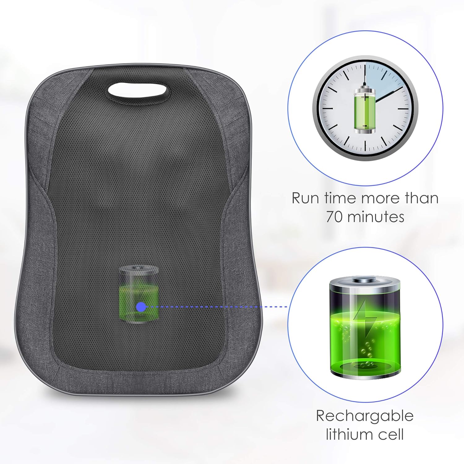 - Cordless & Portable-Comfier shiatsu back massager with heat is powered by rechargeable lithium-ion battery provide you with portable massages anywhere;Lightweight & compact, easy to carry,you can enjoy a relaxing deep tissue massage at home,office and Car (Last 70minutes per full charged.)