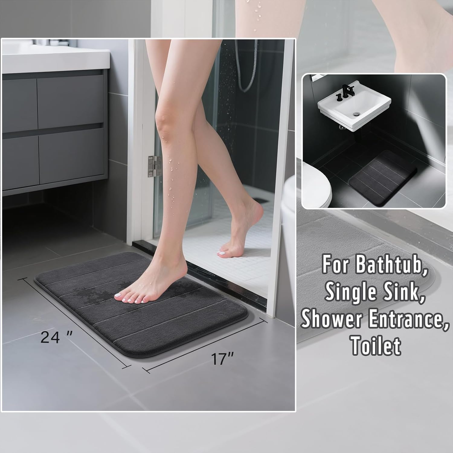 Yimobra Memory Foam Bath Mat, Super Soft Absorbent Bathroom Rug Non Slip 24x17 Inch, Quick Dry, Machine Washable Floor Carpet for Tub Shower, Home Decor Accessories, Dark Gray