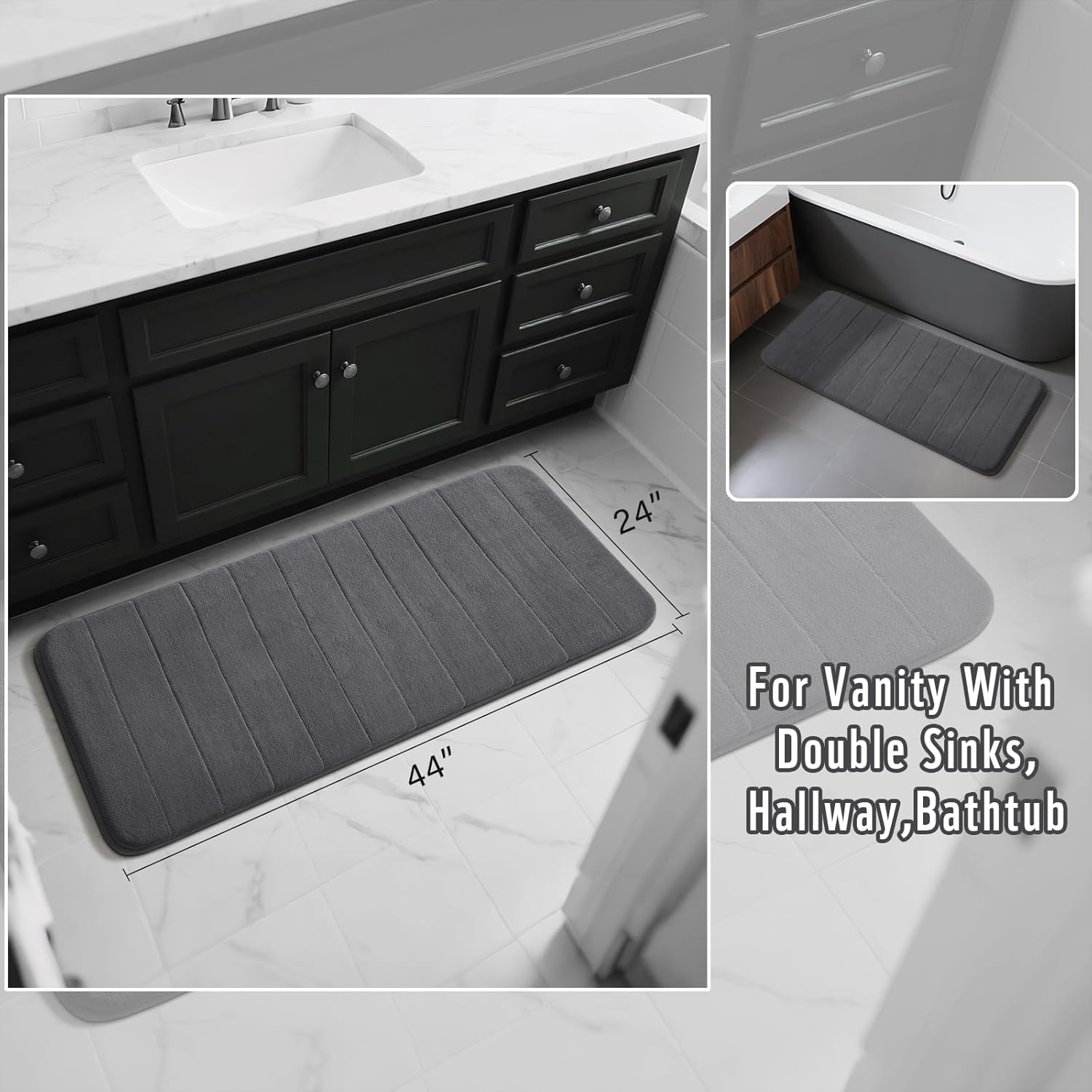 Yimobra Long Bath Mat 44"x24", Super Soft Quick Dry Memory Foam Bathroom Rug, Water Absorbent, Non Slip Backing Machine Washable for Tub Shower, Thick Comfort Support, Dark Gray