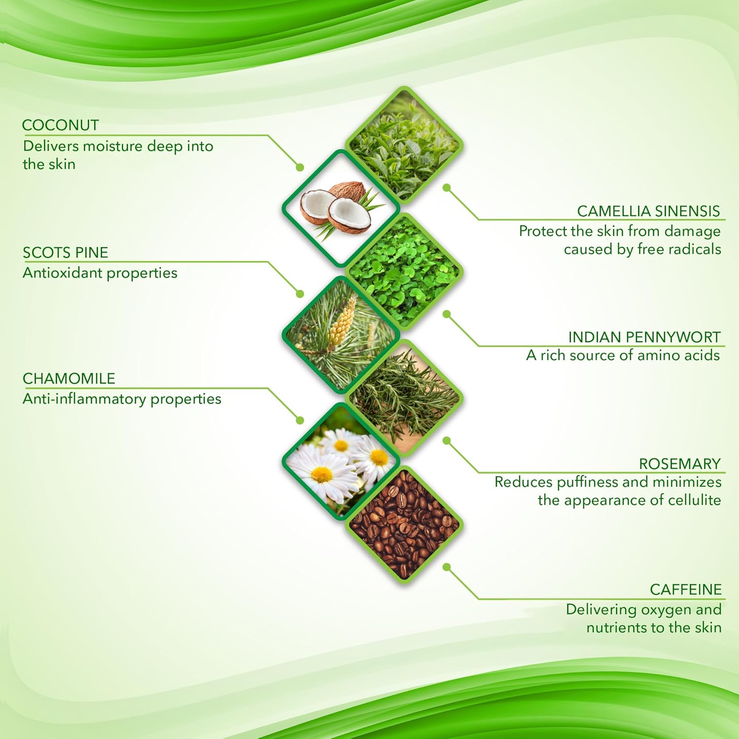 - Active Ingredients : Scots Pine, Chamomile, Camellia Sinensis, Indian Pennywort, Rosemary