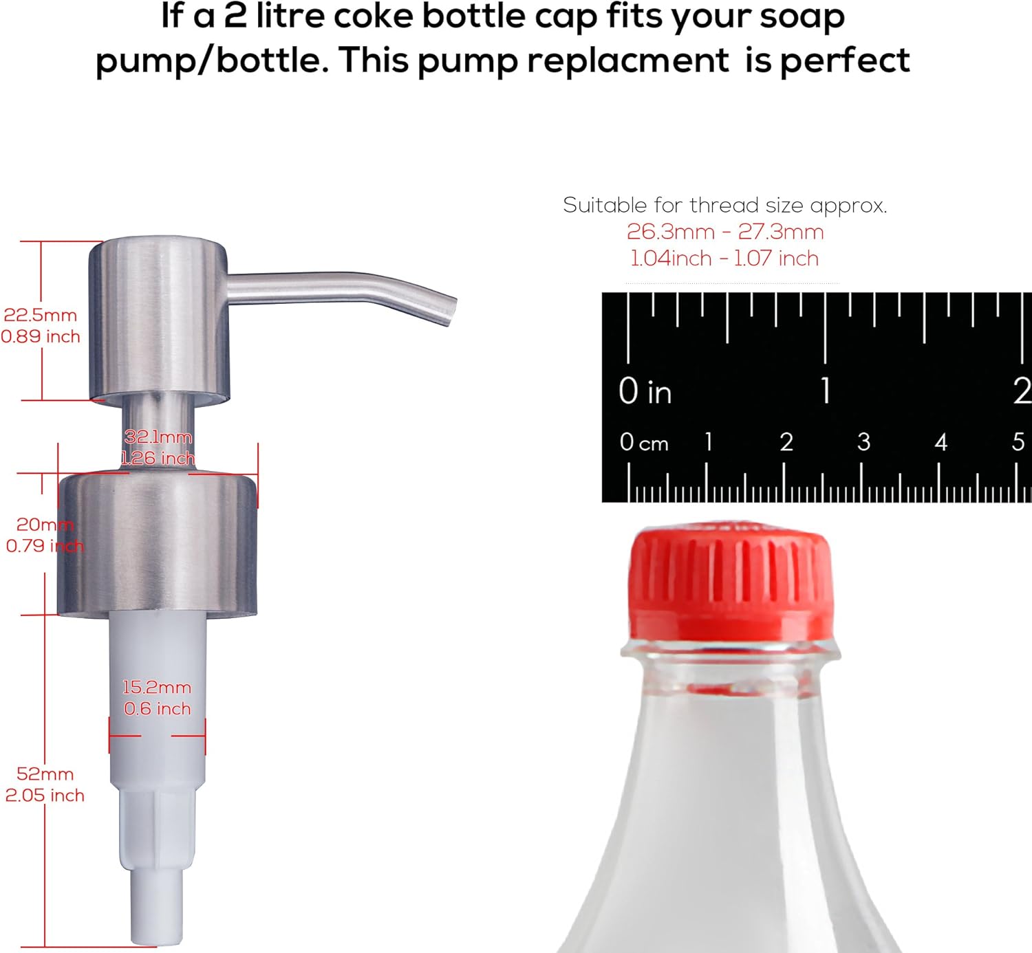 - STANDARD SIZE - Fits most liquid pumps. Test your lotion or soap bottle using a cap from a 2 litre (67.6 oz) coke bottle. If it fits, this pump will work perfectly.